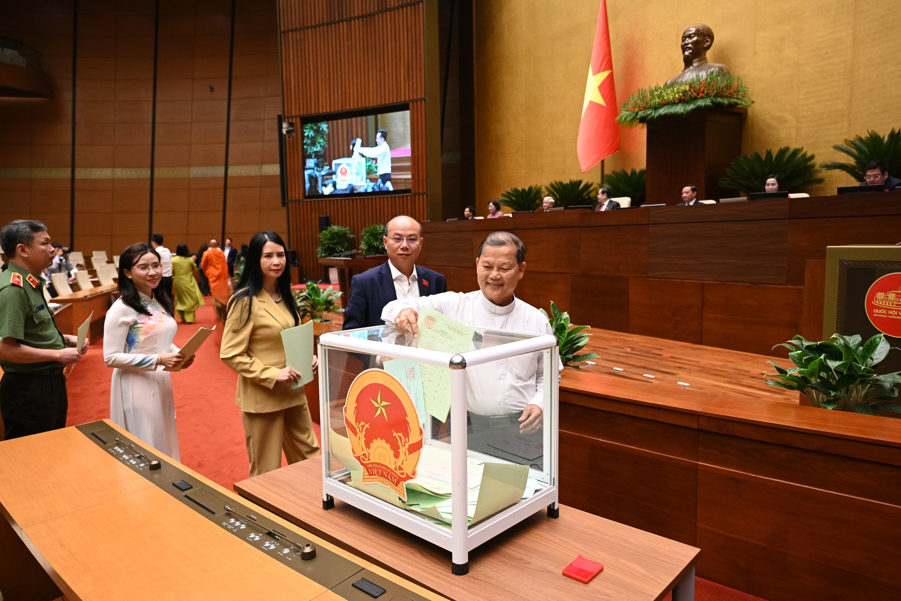 Tổng Bí thư Tô Lâm, Chủ tịch Quốc hội Trần Thanh Mẫn, Thường trực Ban Bí thư Trần Cẩm Tú và Chủ tịch Ủy ban Trung ương MTTQ Việt Nam Bùi Thị Minh Hoài bỏ phiếu bầu Phó Chủ tịch Quốc hội khóa XVI. Ảnh: Phạm Thắng