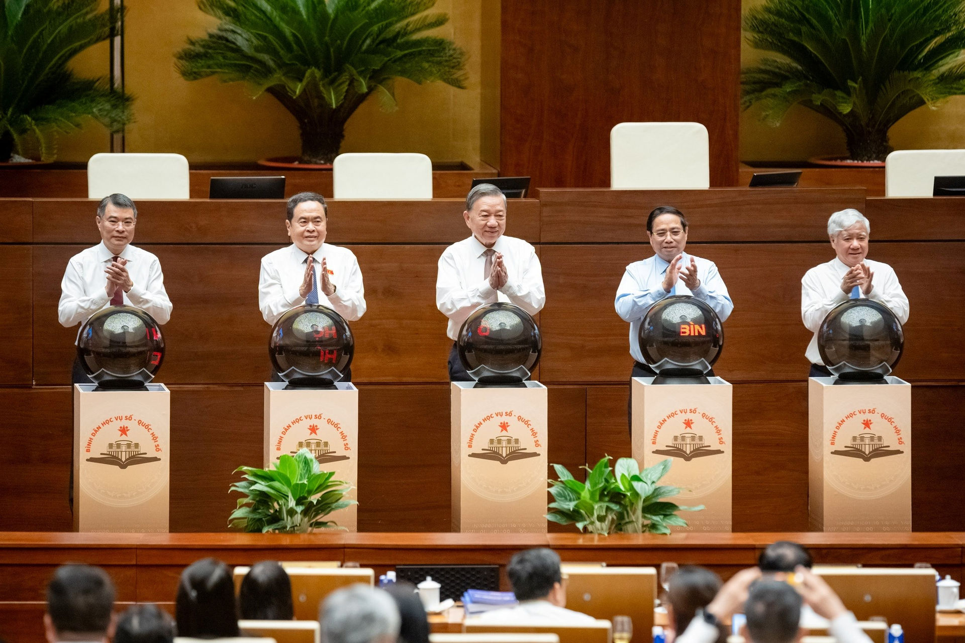 Tổng Bí thư Tô Lâm, Thủ tướng Chính phủ Phạm Minh Chính, Chủ tịch Quốc hội Trần Thanh Mẫn cùng Lãnh đạo, Đảng, Nhà nước thực hiện nghi thức bấm nút khai trương Nền tảng “Bình dân học vụ số - Quốc hội số". Ảnh: VPQH