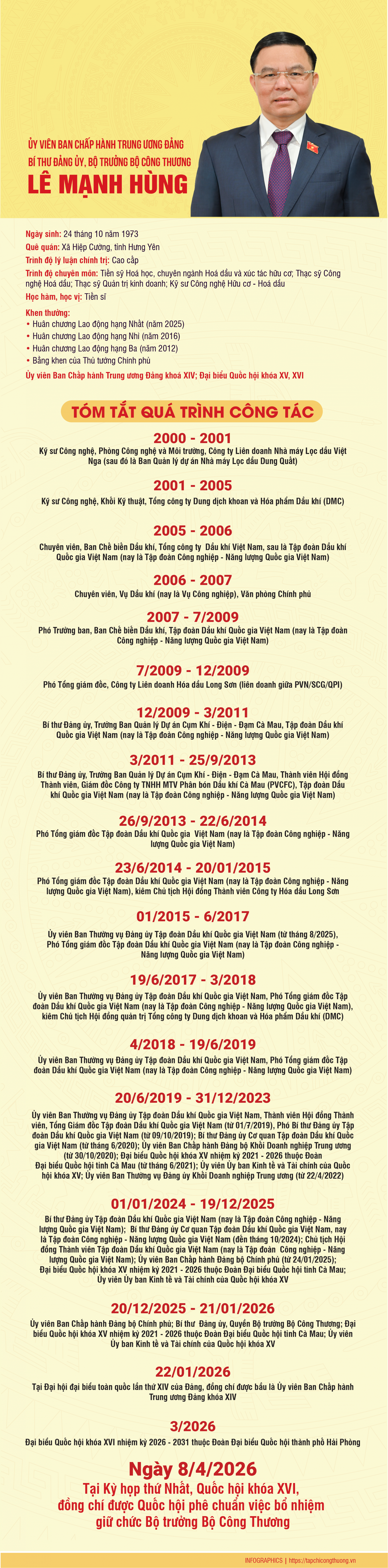 Tân Bộ trưởng Bộ Công Thương Lê Mạnh Hùng, sinh ngày 24/10/1973; quê quán: xã Hiệp Cường, tỉnh Hưng Yên. Trình độ lý luận chính trị: Cao cấp. Trình độ chuyên môn: Tiến sĩ Hóa học; Đại học chuyên ngành hóa Hữu cơ-Hóa dầu.