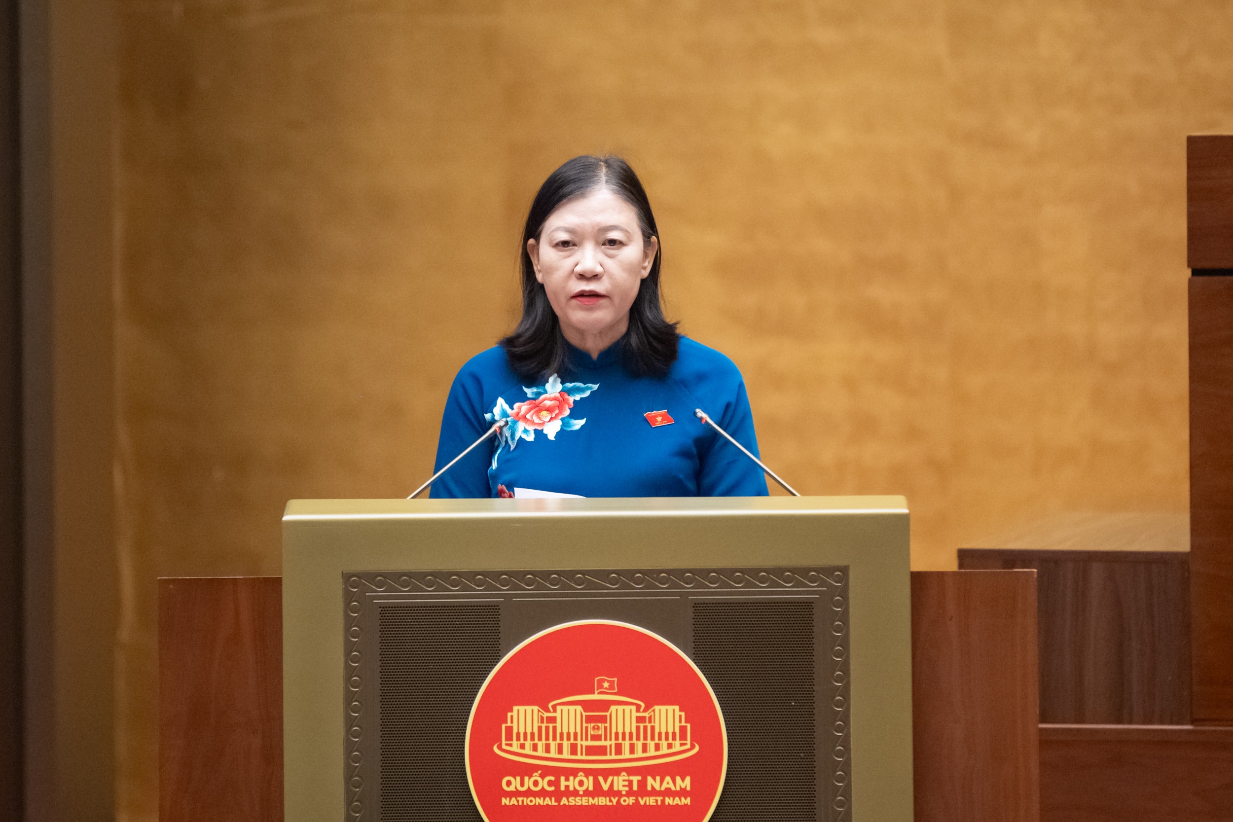 Chủ nhiệm Ủy ban Dân nguyện và Giám sát Lê Thị Nga trình bày Báo cáo tiếp thu, giải trình ý kiến các vị đại biểu Quốc hội về dự kiến Chương trình giám sát của Quốc hội năm 2027 và dự thảo Nghị quyết thành lập Đoàn giám sát chuyên đề của Quốc hội. Ảnh: Quang Khánh