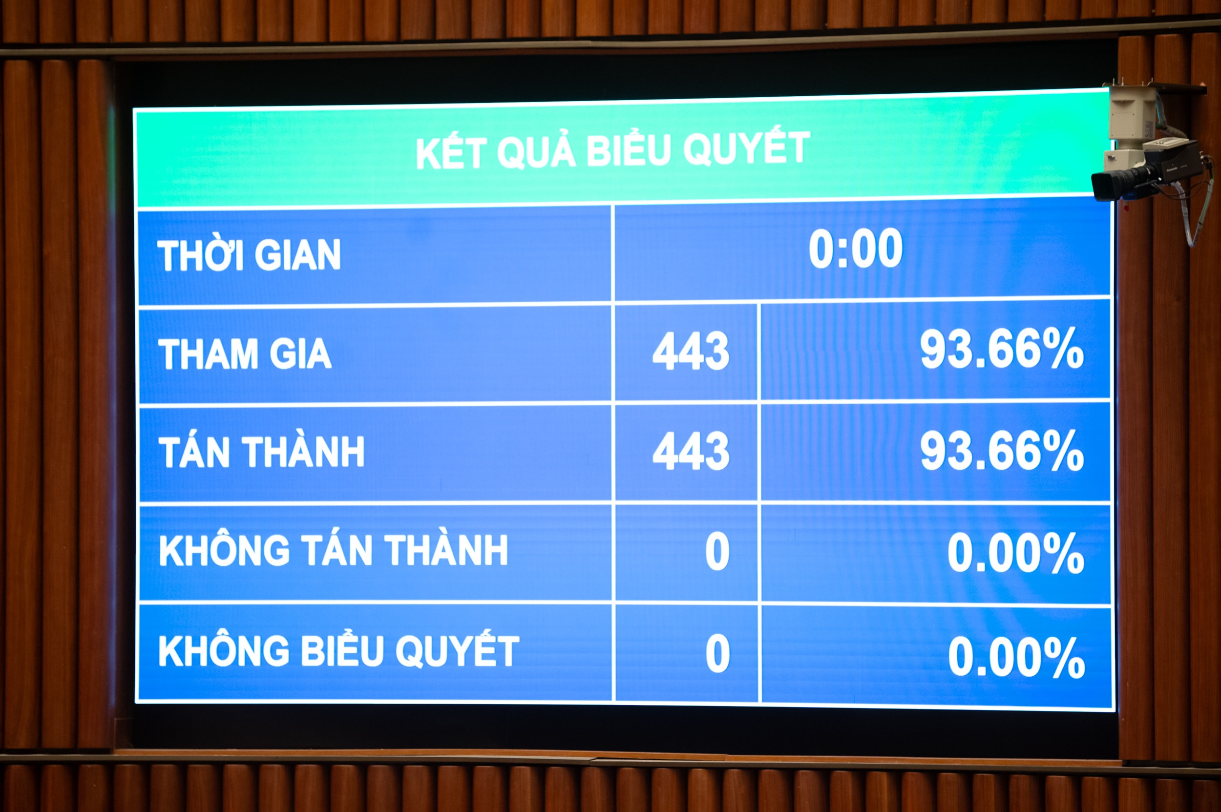 Quốc hội biểu quyết thông qua Nghị quyết sửa đổi, bổ sung một số điều của Nghị quyết số 81/2023/QH15 ngày 9/1/2023 của Quốc hội về Quy hoạch tổng thể quốc gia thời kỳ 2021-2030, tầm nhìn đến năm 2050 với tỷ lệ 443/443 ĐBQH có mặt tán thành, đạt 100%. Ảnh: Phạm Thắng