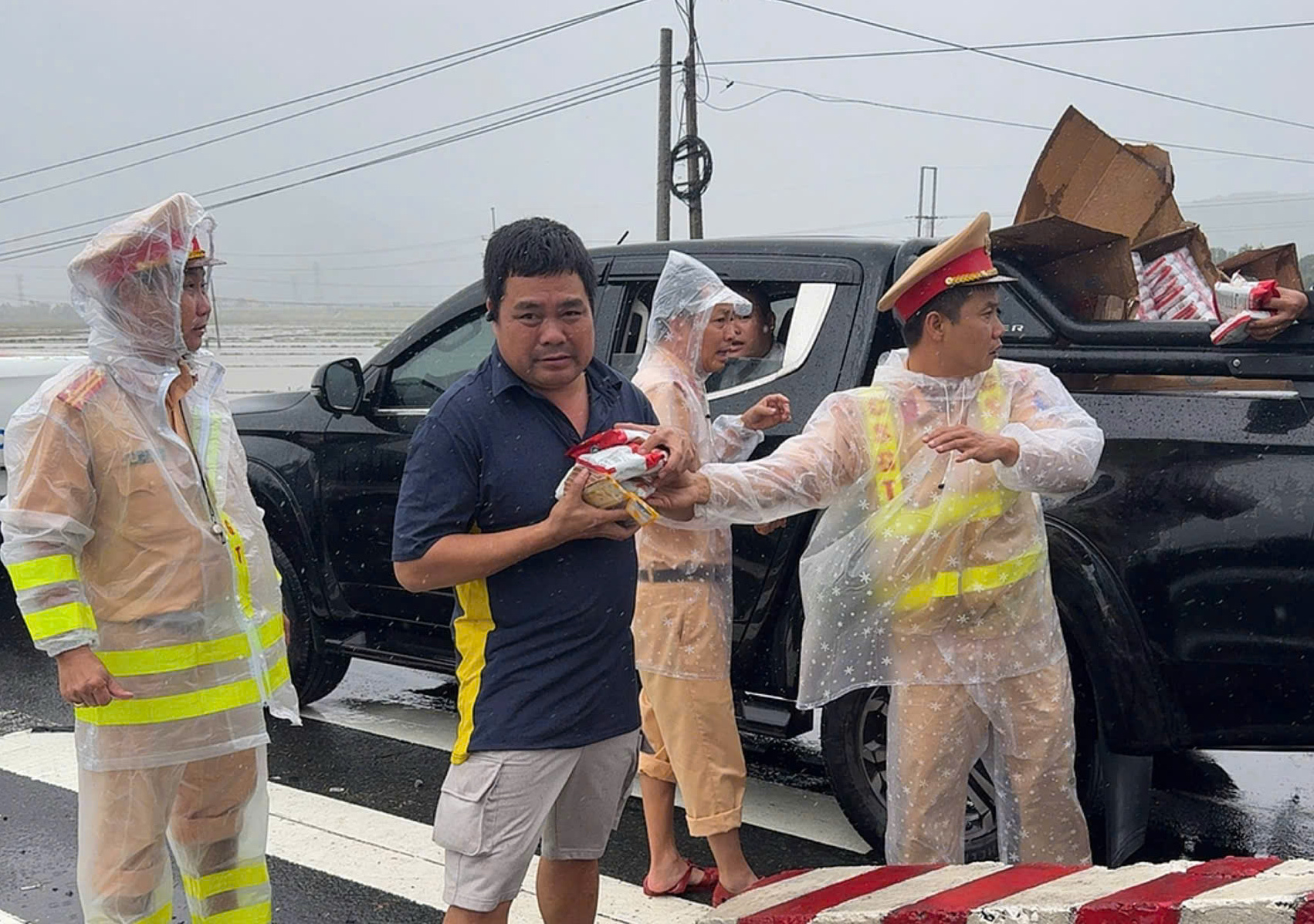 Lực lượng CSGT tiếp đồ ăn, nước uống cho tài xế mắc kẹt trên quốc lộ 1. Ảnh: CACC
