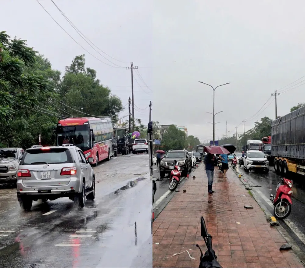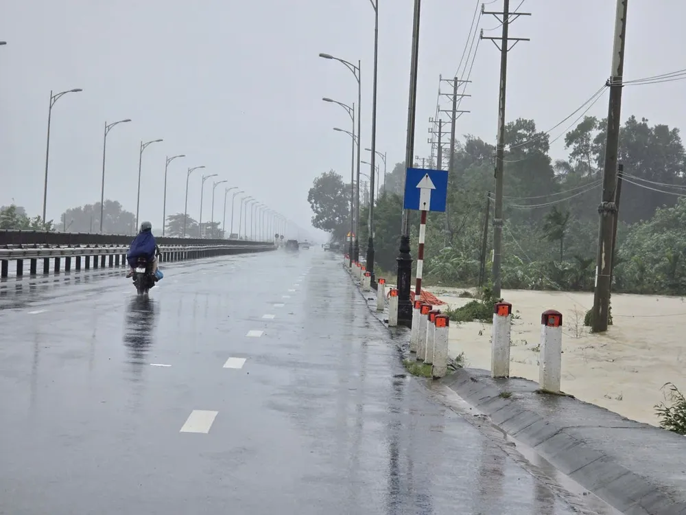 Hai bên quốc lộ 1 đoạn qua phường Hương Trà cũng bị nước lũ áp sát, gió thổi mạnh. Ảnh: MINH TRƯỜNG