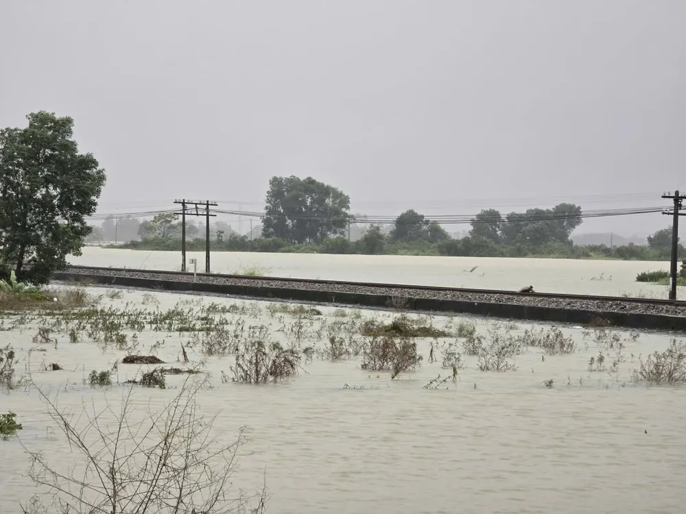 Nước lũ tràn sắp qua đường ray tàu lửa. Ảnh: MINH TRƯỜNG