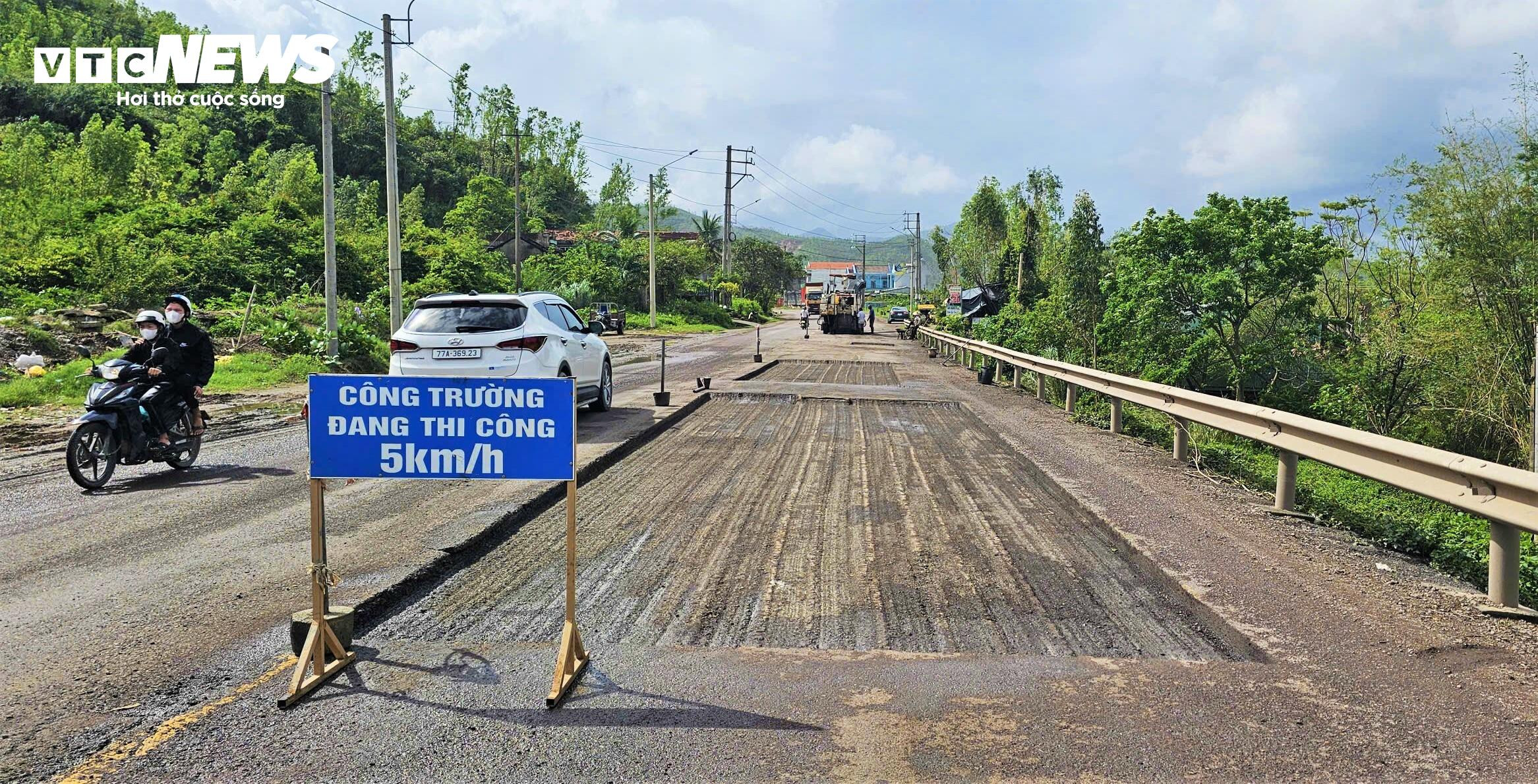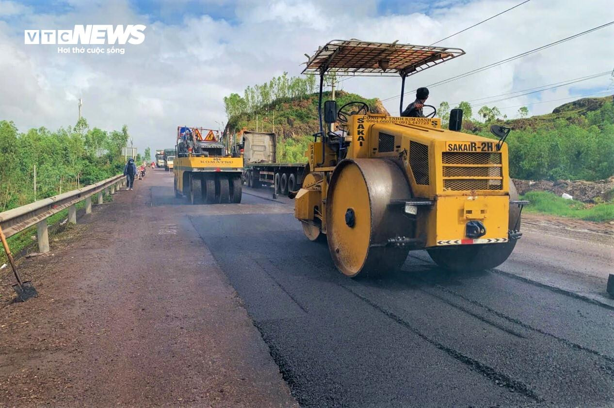 Ghi nhận thực tế trên tuyến, đơn vị quản lý đang tập trung máy xúc, máy ủi và xe lu rung tranh thủ những lúc thời tiết tạnh ráo để tái thiết kế mặt đường. Các vị trí bị sụt lún sâu được đào bỏ lớp nền yếu, thay thế bằng cấp phối đá dăm và thảm nhựa.