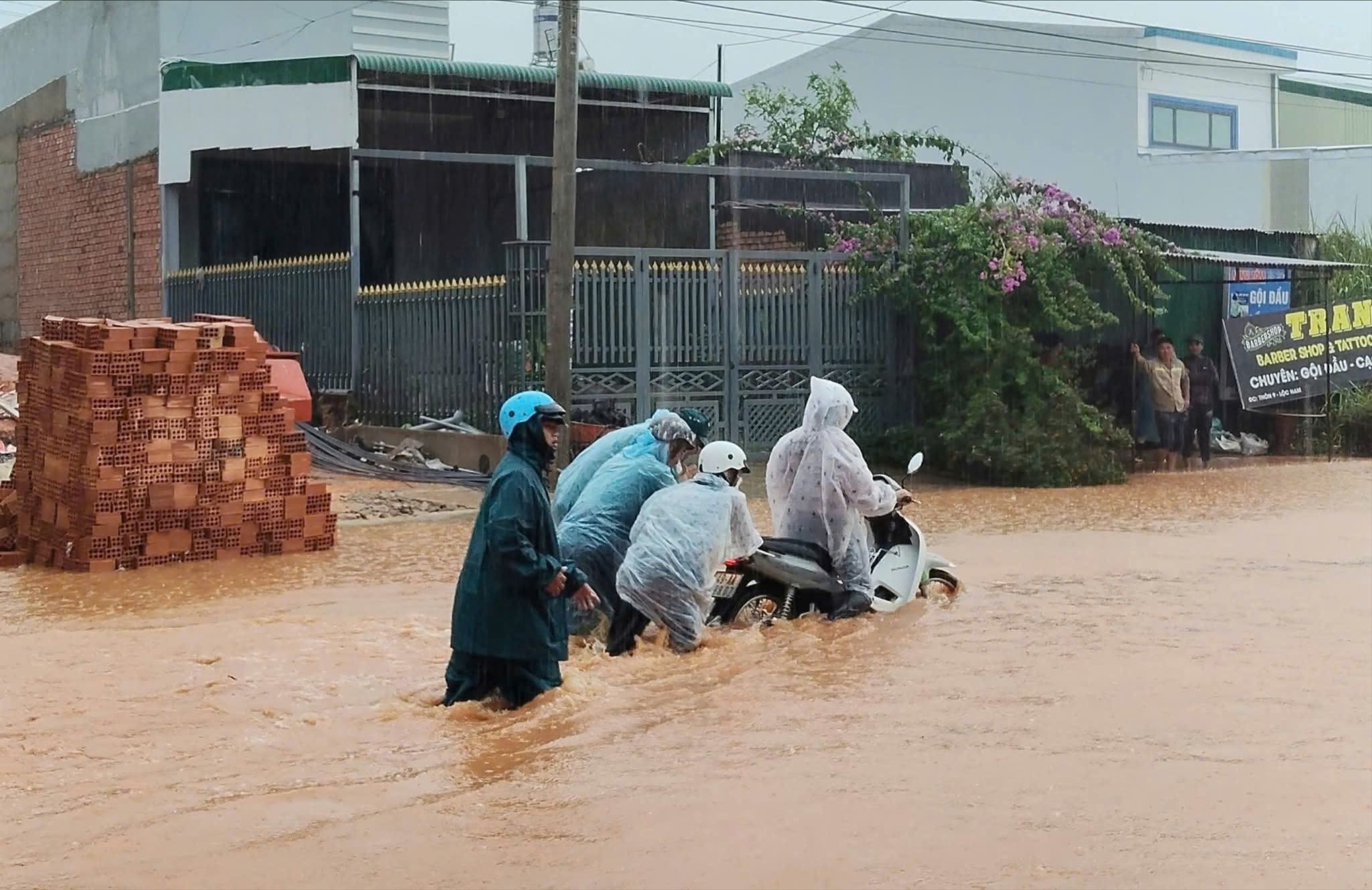 Người dân nỗ lực đẩy xe máy qua đoạn đường bị ngập sâu sau mưa lớn tại xã Bảo Lâm 3, tỉnh Lâm Đồng