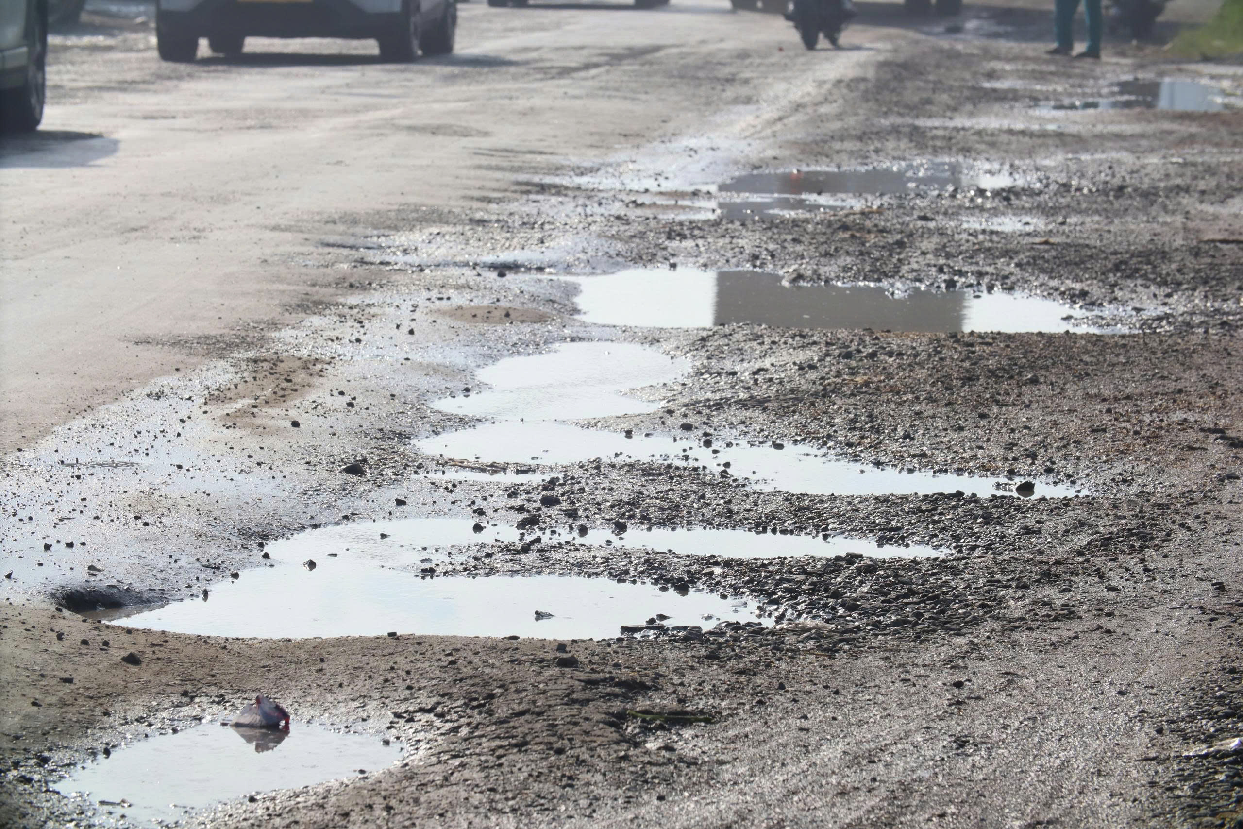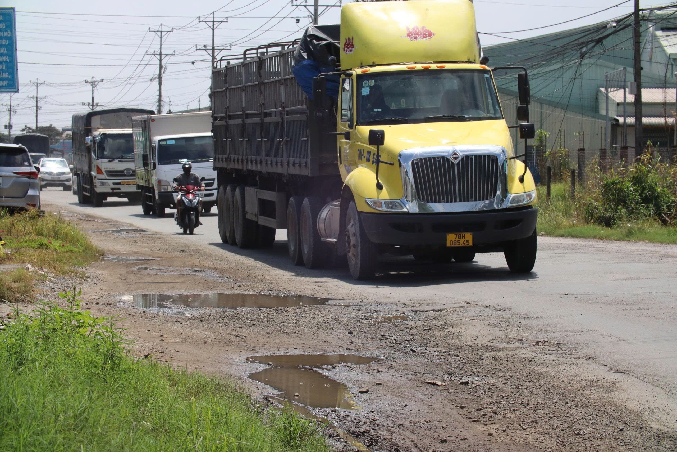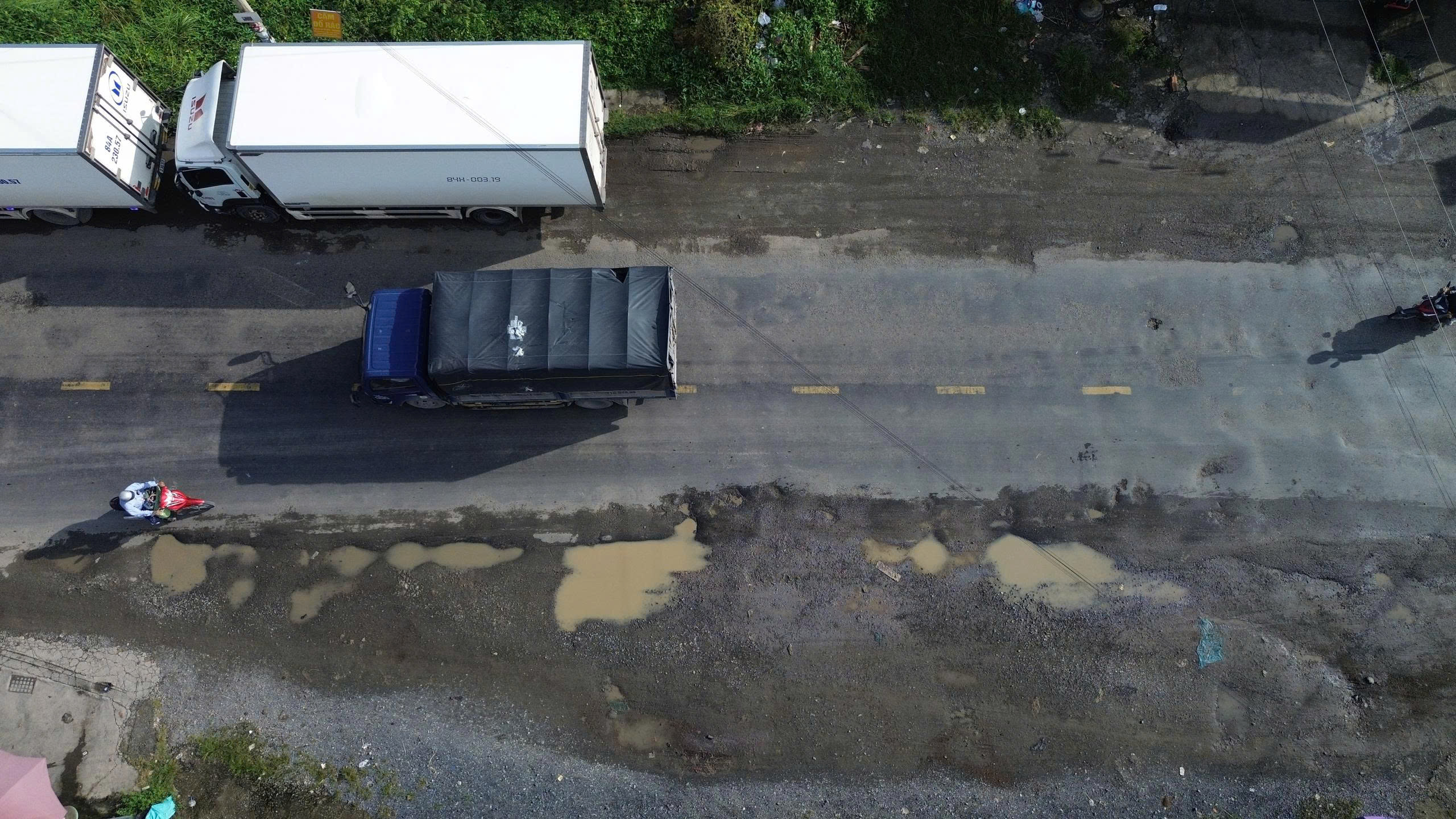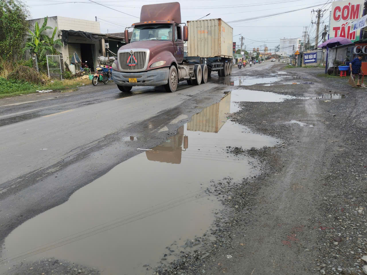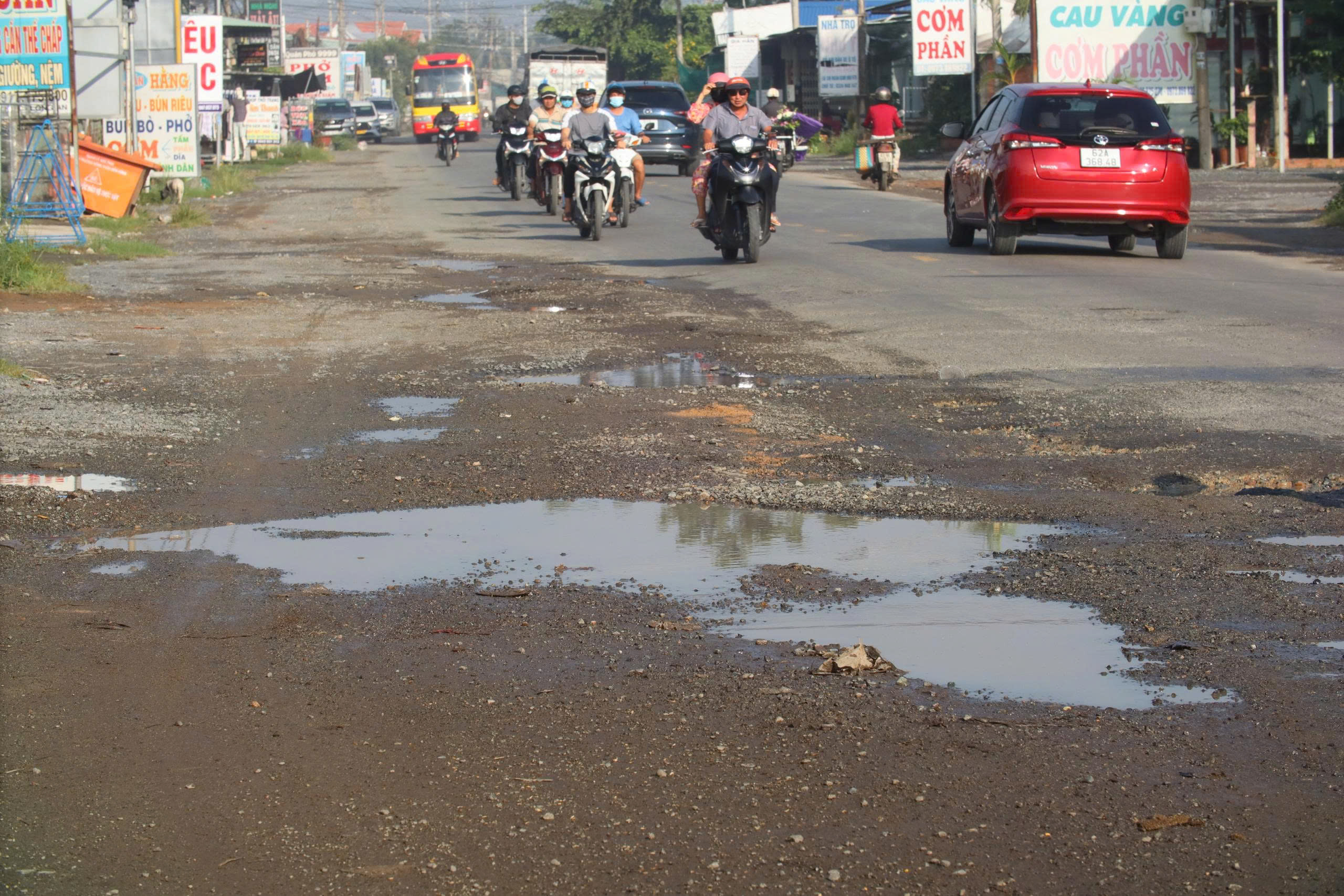 Nguy hiểm hơn, mặt đường hiện đã xuống cấp nghiêm trọng, hằn lún vết bánh xe, "ổ gà, ổ voi" chi chít suốt cả tuyến đường, nhiều đoạn nhìn như một "chiếc áo rách" không còn chỗ để vá.
