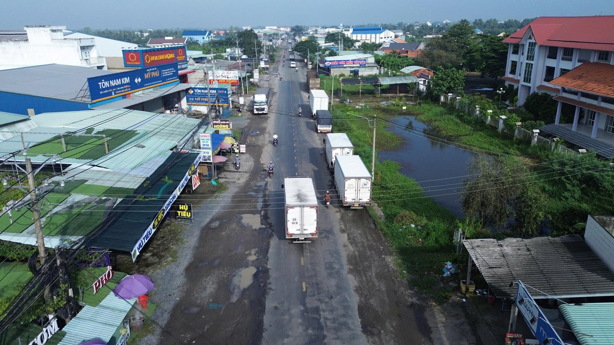 Chạy dọc tuyến Quốc lộ 62, nhiều đoạn người dân dựng liều, cất nhà tạm… để mua bán, lấn chiếm hành lang lộ giới. Trong khi đó mặt đường thì hẹp, chỉ có 2 làn xe, nhiều đoạn không còn vạch sơn giữa để phân làn đường, rất nguy hiểm cho người, phương tiện tham gia giao thông.