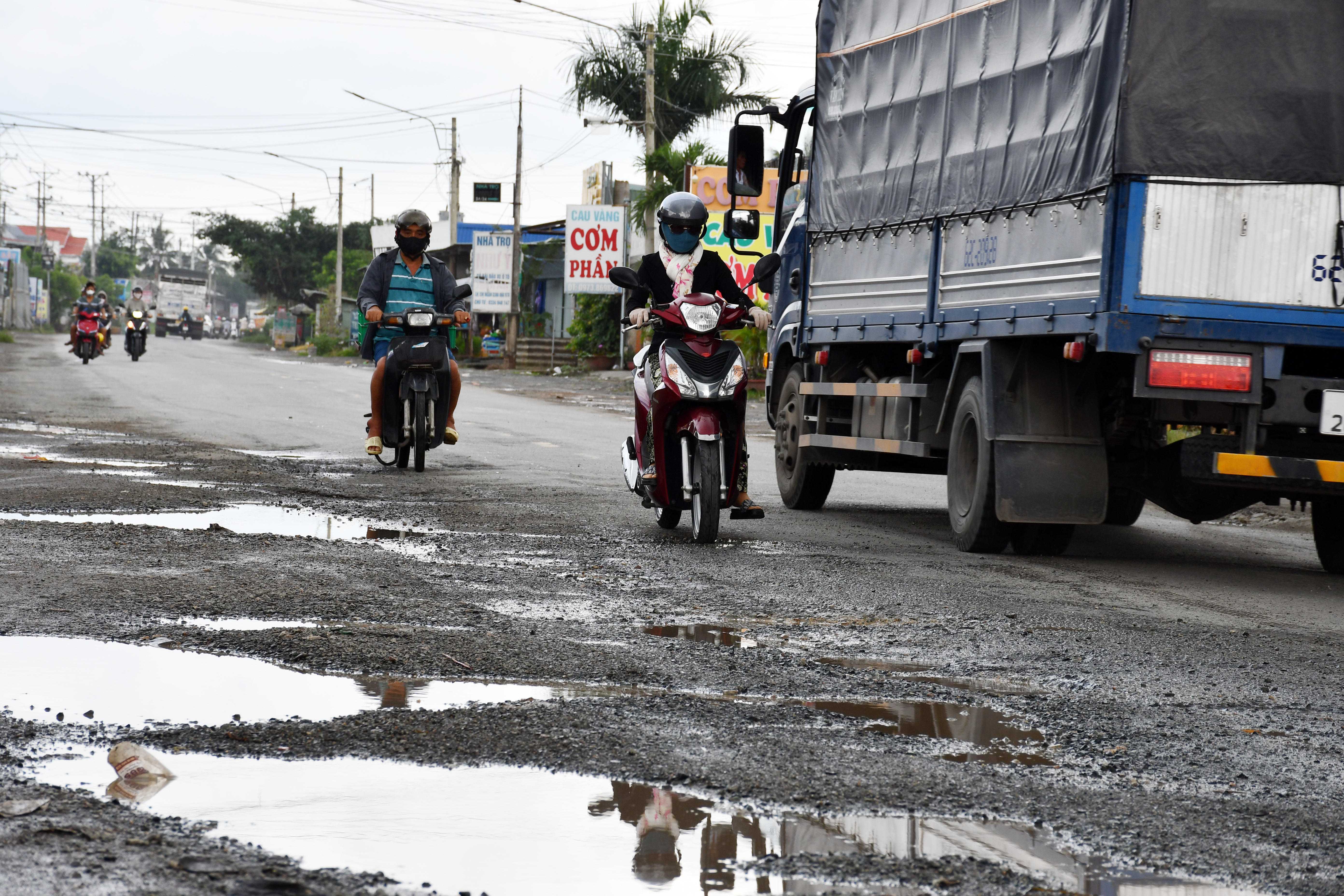 Theo ghi nhận của PV Báo SGGP, ngày 7-11, sau nhiều ngày mưa lớn, mặt đường của Quốc lộ 62 tiếp tục xuống cấp nghiêm trọng, xuất hiện chi chít “ổ voi, ổ gà”. Trên toàn bộ tuyến đường xuất hiện nhiều đoạn lún sâu, đọng nước, gây khó khăn cho lưu thông, tiềm ẩn tai nạn và làm tăng chi phí vận chuyển hàng hóa.
