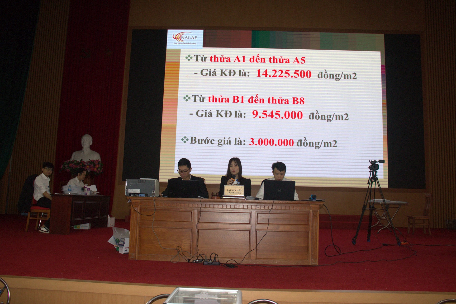 Tại phiên đấu giá, 13 thửa đất với tổng diện tích 1.323,1m² được đưa ra đấu giá, diện tích mỗi thửa từ 70,4m² đến 101,8m². Giá khởi điểm đối với các thửa đất lô A là 14,225 triệu đồng/m², lô B là 9,545 triệu đồng/m².