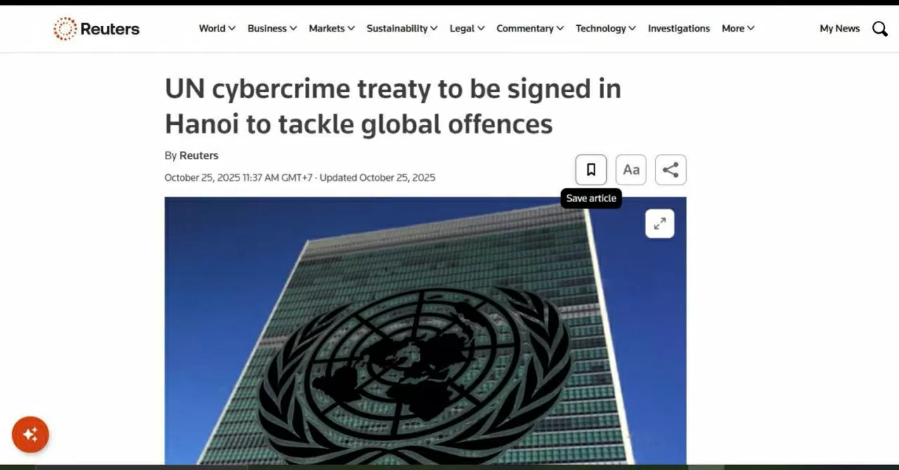Hãng Reuters ngày 25/10 đưa tin, đây là Công ước mang tính bước ngoặt của LHQ về tội phạm mạng, nhằm giải quyết các hành vi phạm tội gây thiệt hại hàng nghìn tỷ USD cho nền kinh tế toàn cầu mỗi năm. (Ảnh chụp màn hình)