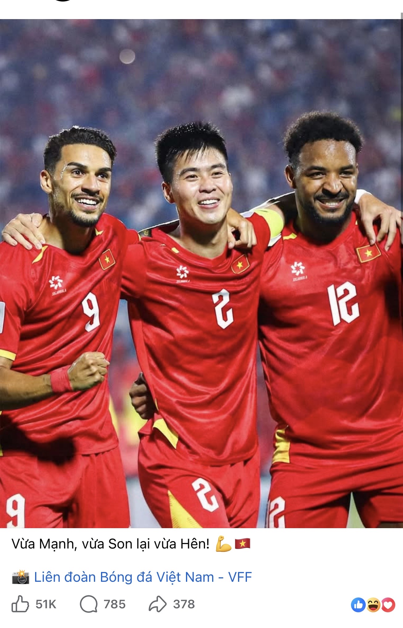 Trong khi đó, fanpage của FIFA cũng chia sẻ về chiến thắng của Việt Nam trước Malaysia bằng dòng trạng thái thú vị, "Vừa Mạnh, vừa Son lại vừa Hên", cùng hình ảnh ăn mừng của đội trưởng Duy Mạnh, Xuân Son và Hoàng Hên, 3 người đã làm nên 3 bàn thắng cho Việt Nam, trong đó Duy Mạnh, mở tỉ số, Xuân Son lập cú đúp, còn Hoàng Hên có 1 kiến tạo.