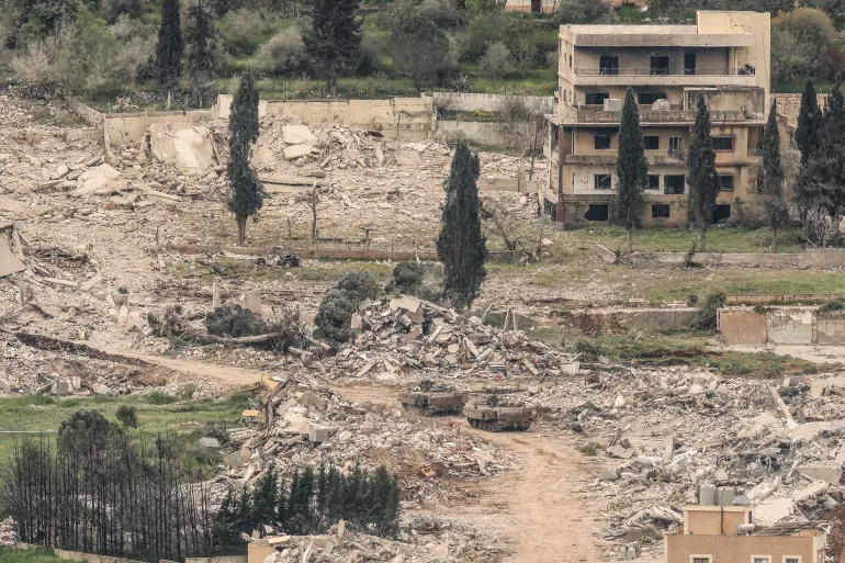 Xe bọc thép của Israel bên cạnh các tòa nhà bị phá hủy ở miền nam Lebanon hôm 16-4. Ảnh: Jack Guez/AFP