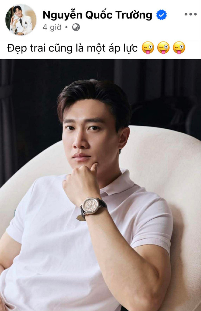 Mới đây, diễn viên Quốc Trường thu hút sự chú ý khi đăng tải một bức ảnh cá nhân kèm dòng trạng thái đầy dí dỏm: “Đẹp trai cũng là một áp lực”. Chỉ sau ít giờ, bài viết đã thu hút lượng tương tác lớn, kéo theo hàng loạt bình luận rôm rả từ người hâm mộ.