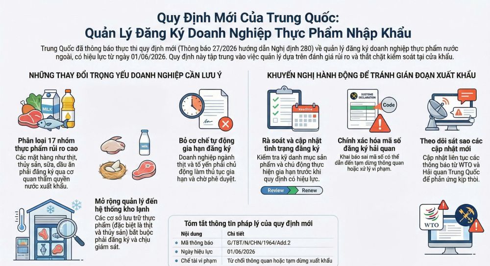 Trung Quốc là thị trường xuất khẩu thực phẩm quan trọng của Việt Nam. Việc tăng cường quản lý đăng ký doanh nghiệp và kiểm soát theo rủi ro có thể tác động trực tiếp đến hoạt động xuất khẩu, đặc biệt đối với các ngành hàng nông sản, thủy sản và thực phẩm chế biến.