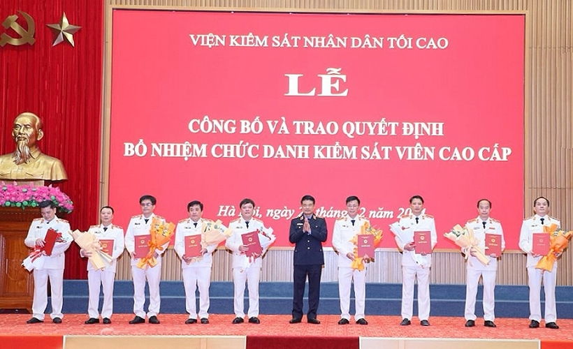 Đồng chí Nguyễn Huy Tiến, Viện trưởng VKSND tối cao trao quyết định bổ nhiệm chức danh Kiểm sát viên cao cấp cho các cá nhân. (Ảnh minh họa)