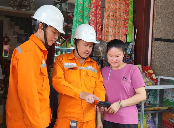 Nhân viên EVNHCMC hướng dẫn khách hàng sử dụng ứng dụng chăm sóc khách hàng trên thiết bị di động.