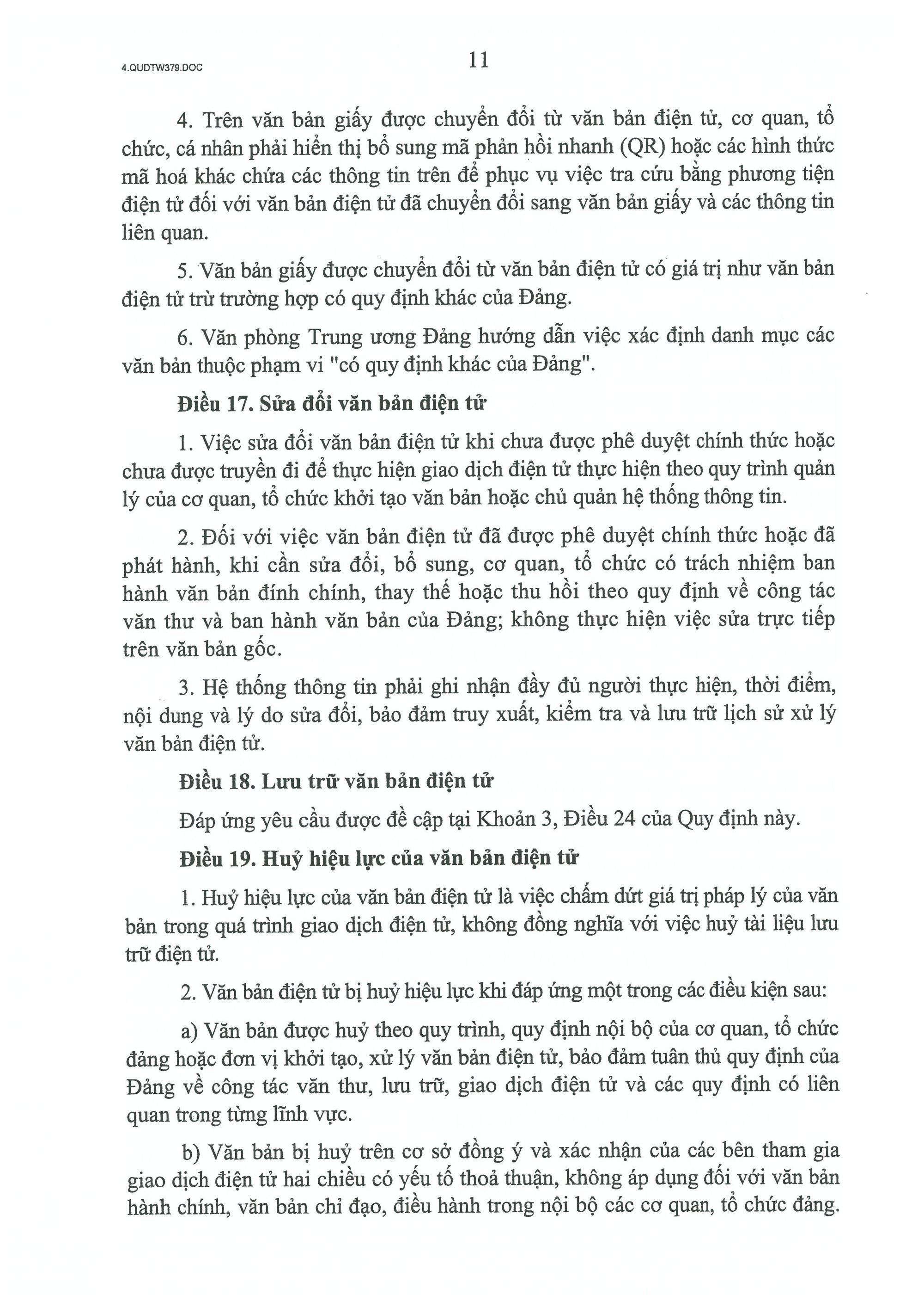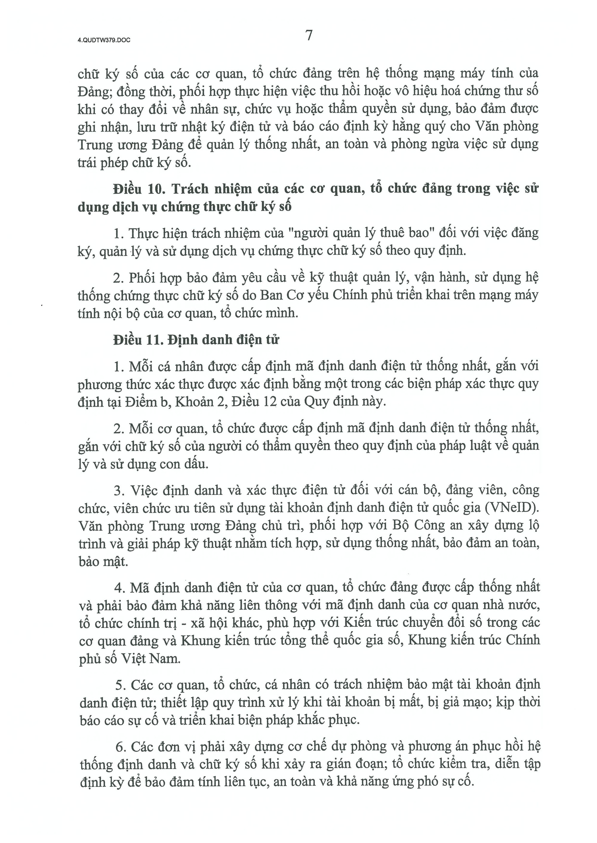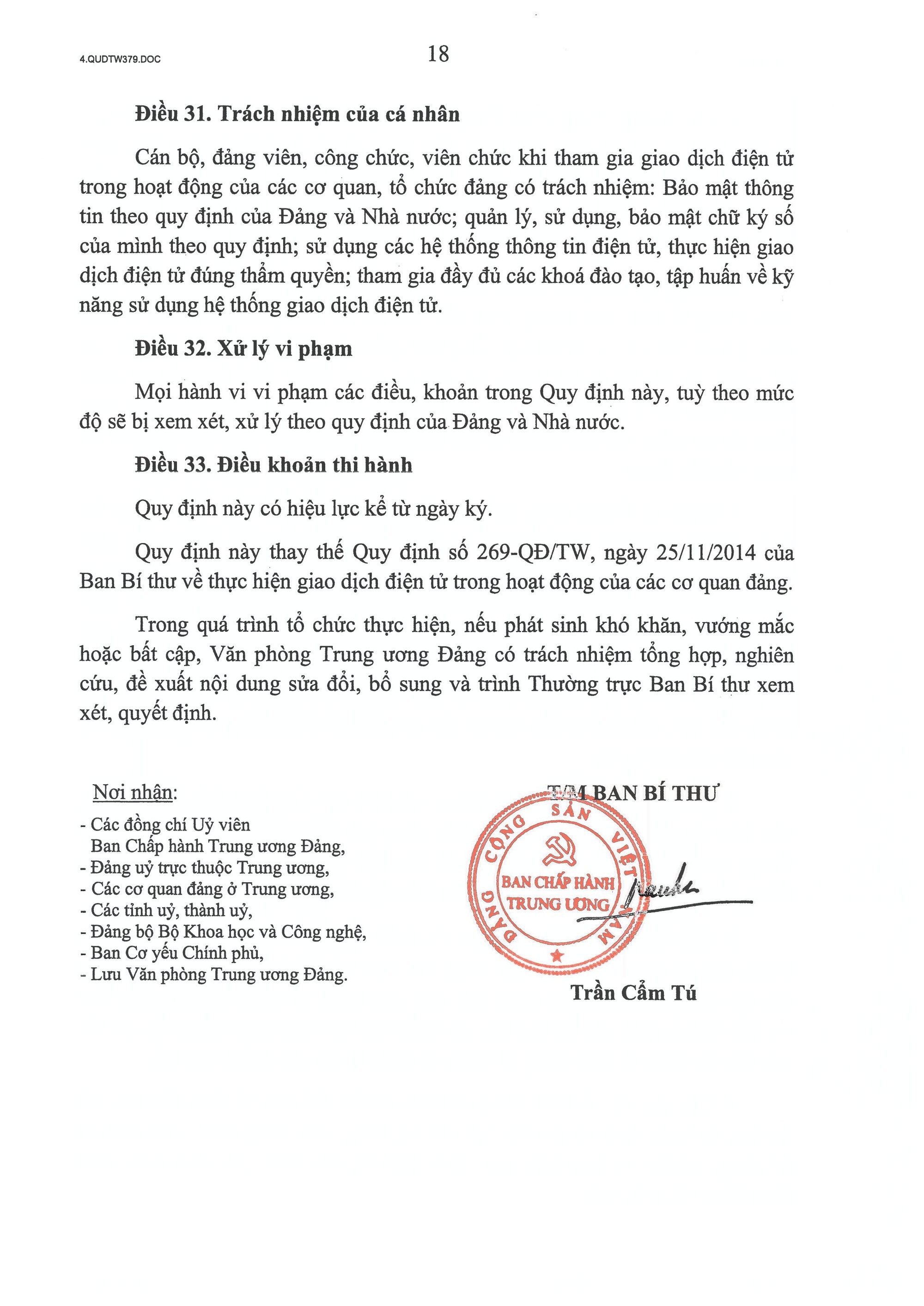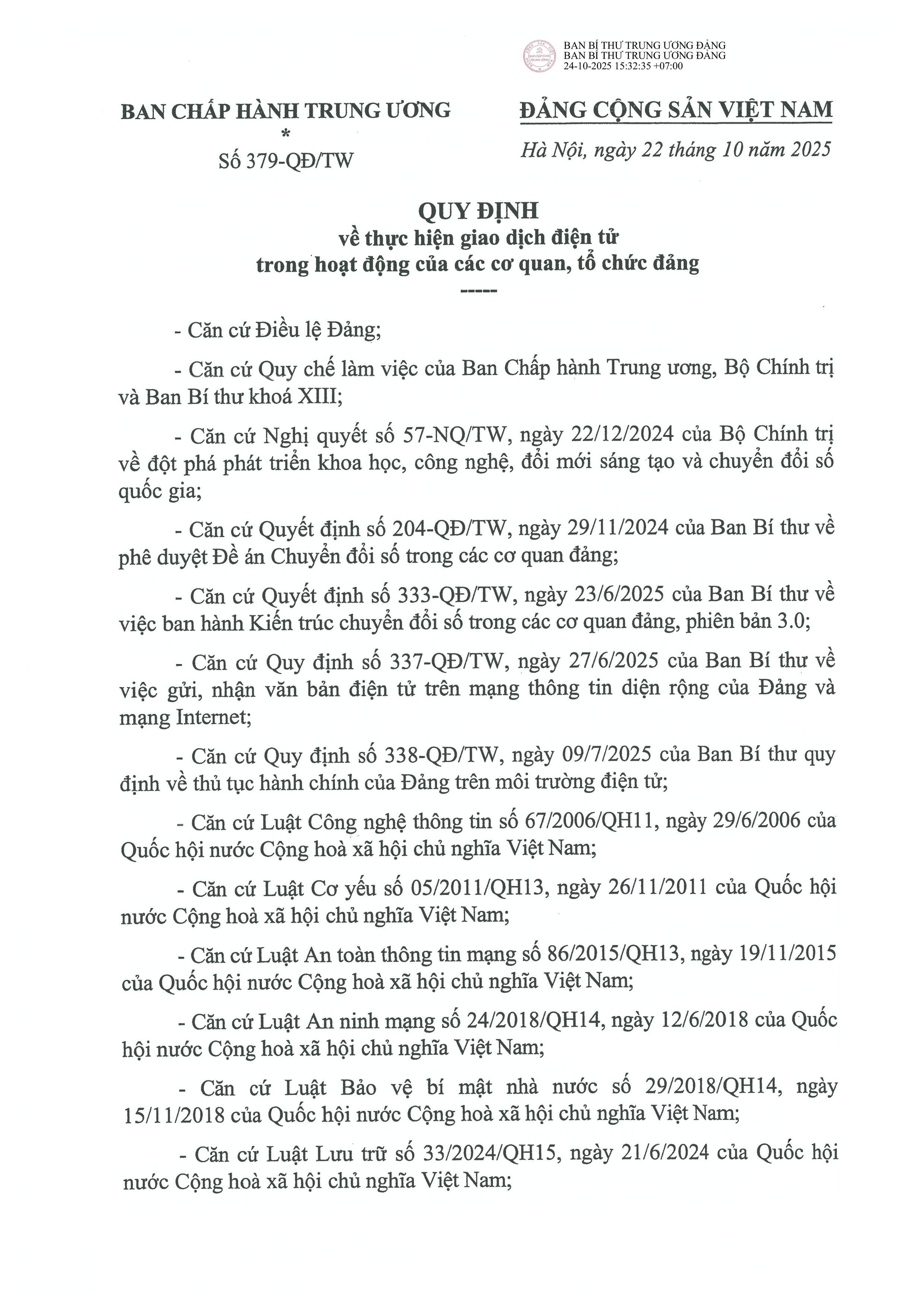 Theo Cổng TTĐT Đảng Cộng sản Việt Nam, ngày 22/10/2025, đồng chí Trần Cẩm Tú, Ủy viên Bộ Chính trị, Thường trực Ban Bí thư đã ký ban hành Quy định số 379-QĐ/TW của Ban Bí thư quy định về thực hiện giao dịch điện tử trong hoạt động của các cơ quan, tổ chức đảng.
