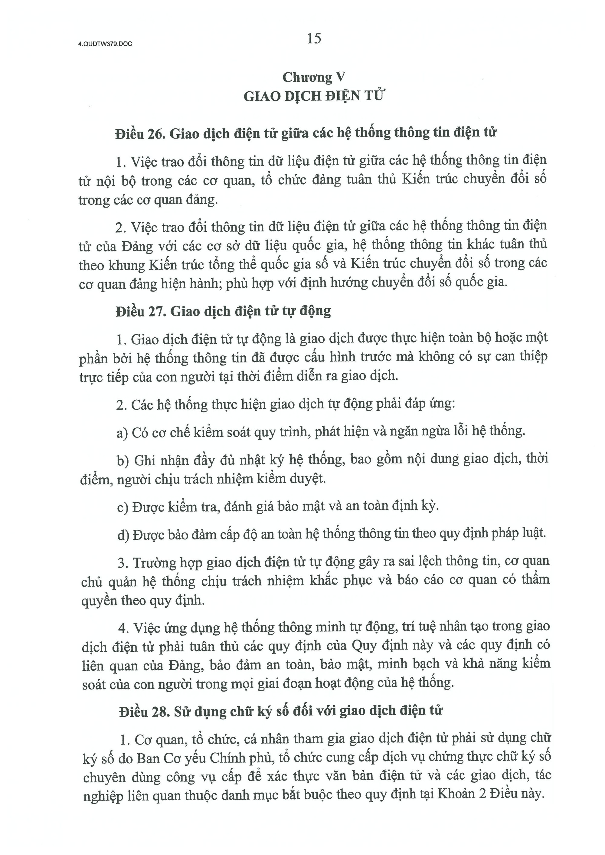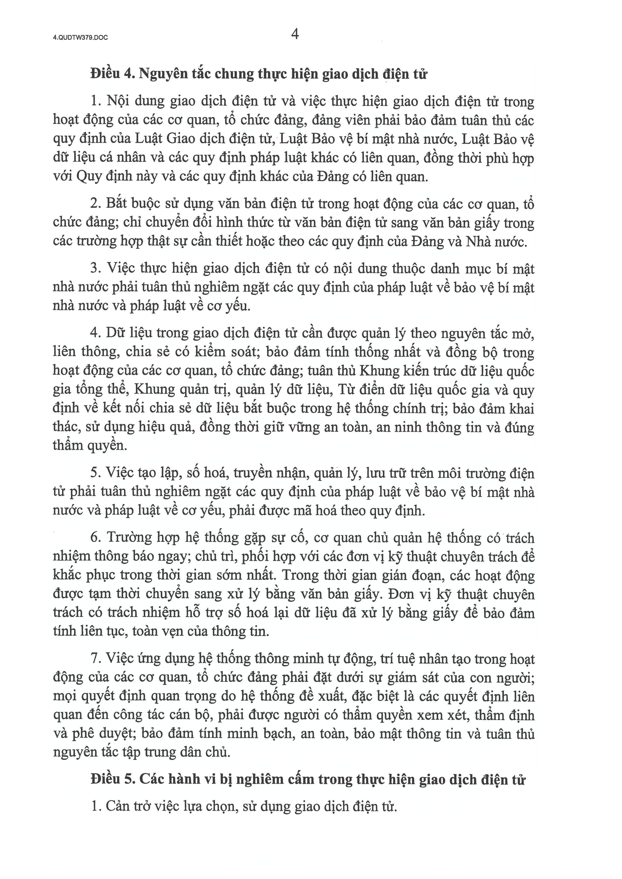 4. Dữ liệu trong giao dịch điện tử cần được quản lý theo nguyên tắc mở, liên thông, chia sẻ có kiểm soát; bảo đảm tính thống nhất và đồng bộ trong hoạt động của các cơ quan, tổ chức đảng; tuân thủ Khung kiến trúc dữ liệu quốc gia tổng thể, Khung quản trị, quản lý dữ liệu, Từ điển dữ liệu quốc gia và quy định về kết nối chia sẻ dữ liệu bắt buộc trong hệ thống chính trị; bảo đảm khai thác, sử dụng hiệu quả, đồng thời giữ vững an toàn, an ninh thông tin và đúng thẩm quyền.