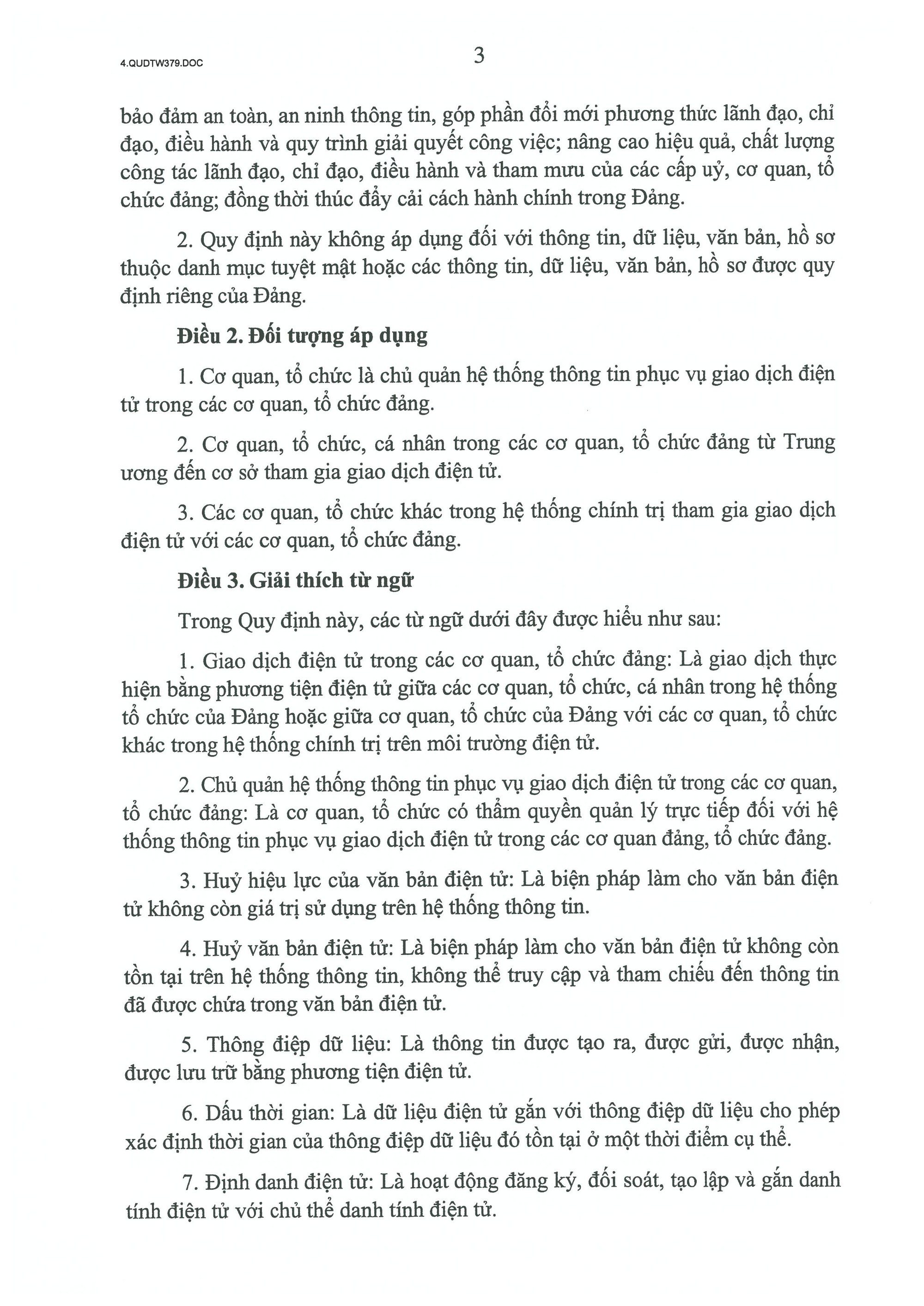 Quy định được áp dụng đối với cơ quan, tổ chức là chủ quản hệ thống thông tin phục vụ giao dịch điện tử trong các cơ quan, tổ chức đảng; cơ quan, tổ chức, cá nhân trong các cơ quan, tổ chức đảng từ Trung ương đến cơ sở tham gia giao dịch điện tử; các cơ quan, tổ chức khác trong hệ thống chính trị tham gia giao dịch điện tử với các cơ quan, tổ chức đảng.