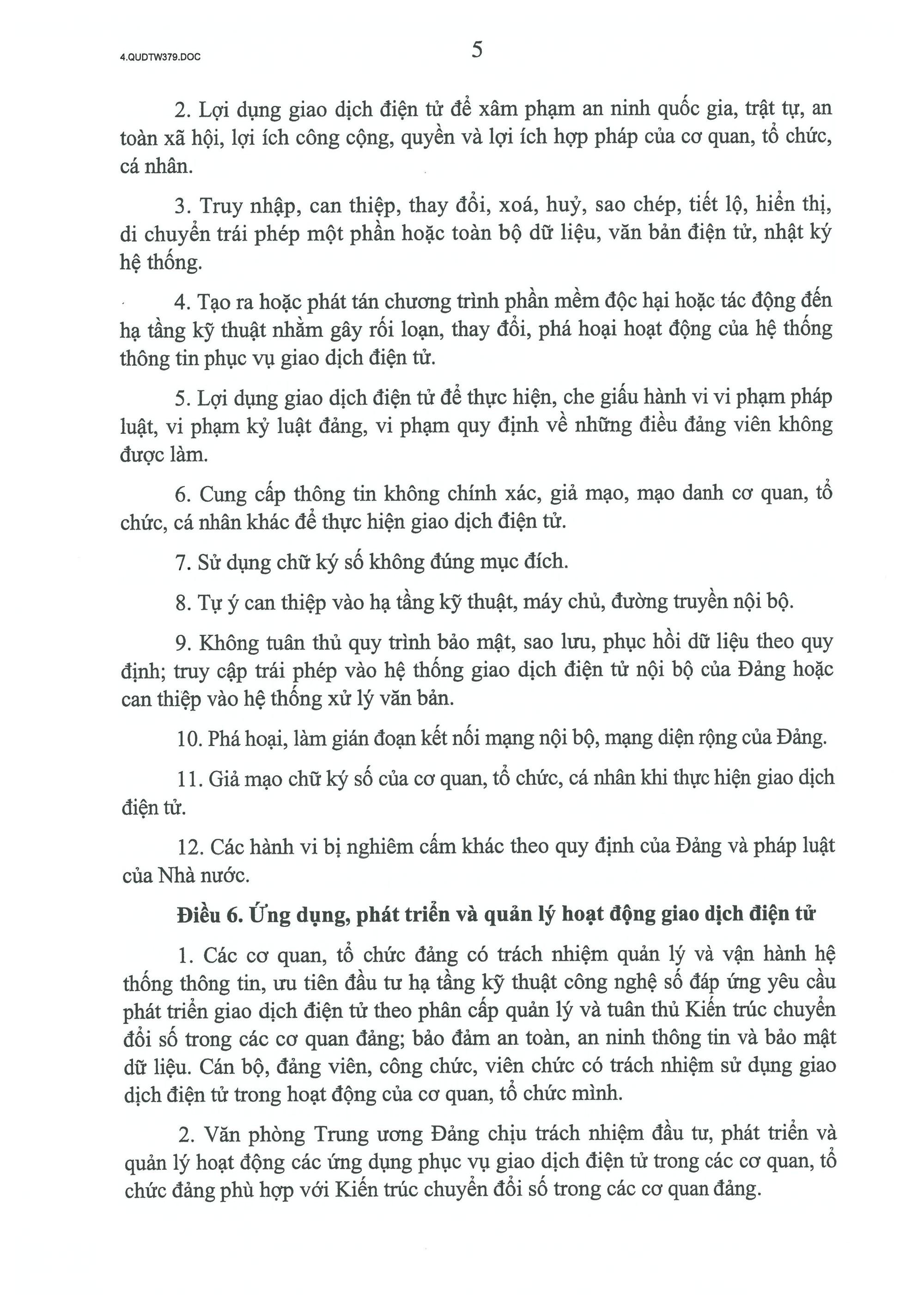 5. Lợi dụng giao dịch điện tử để thực hiện, che giấu hành vi vi phạm pháp luật, vi phạm kỷ luật đảng, vi phạm quy định về những điều đảng viên không được làm.
