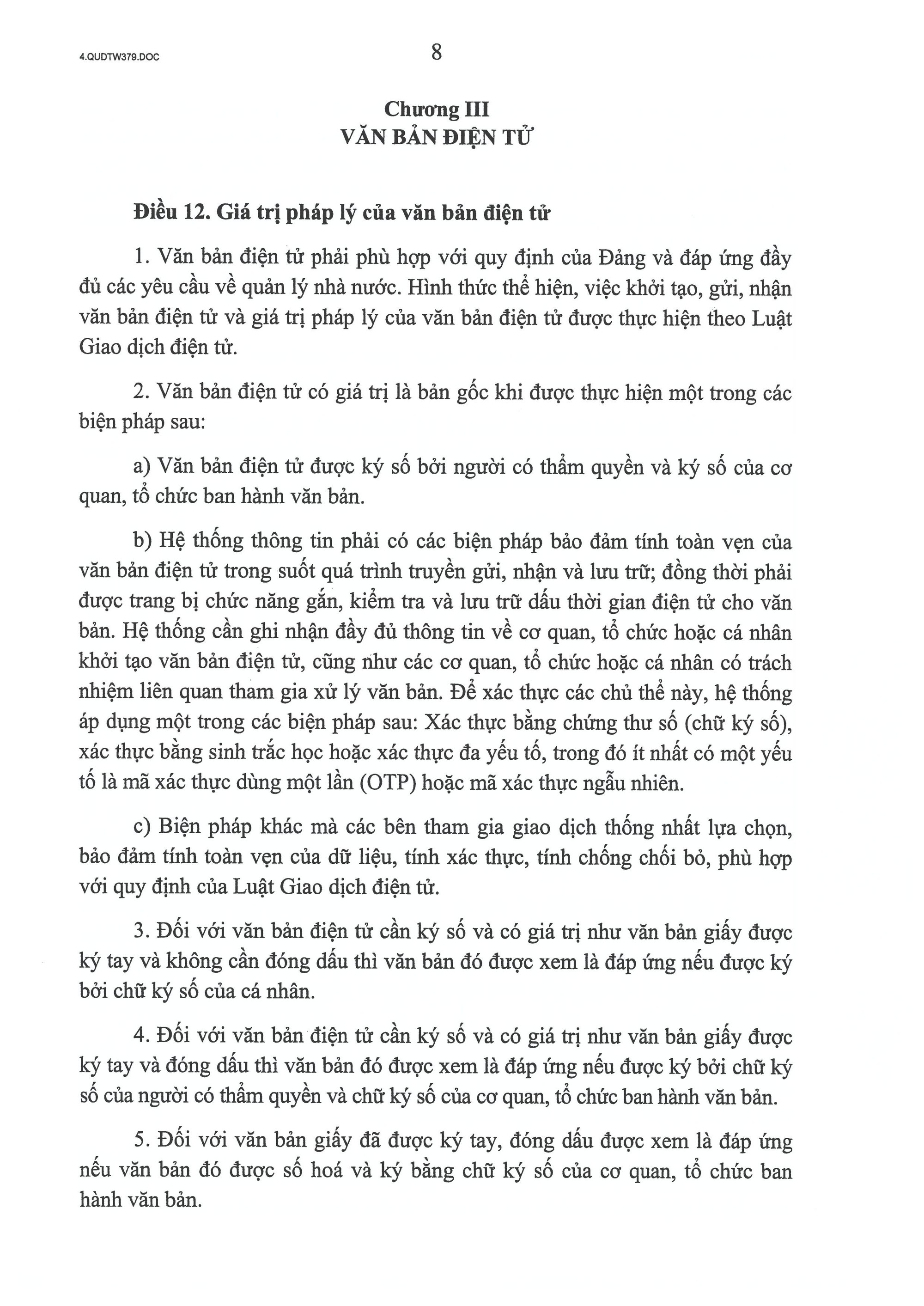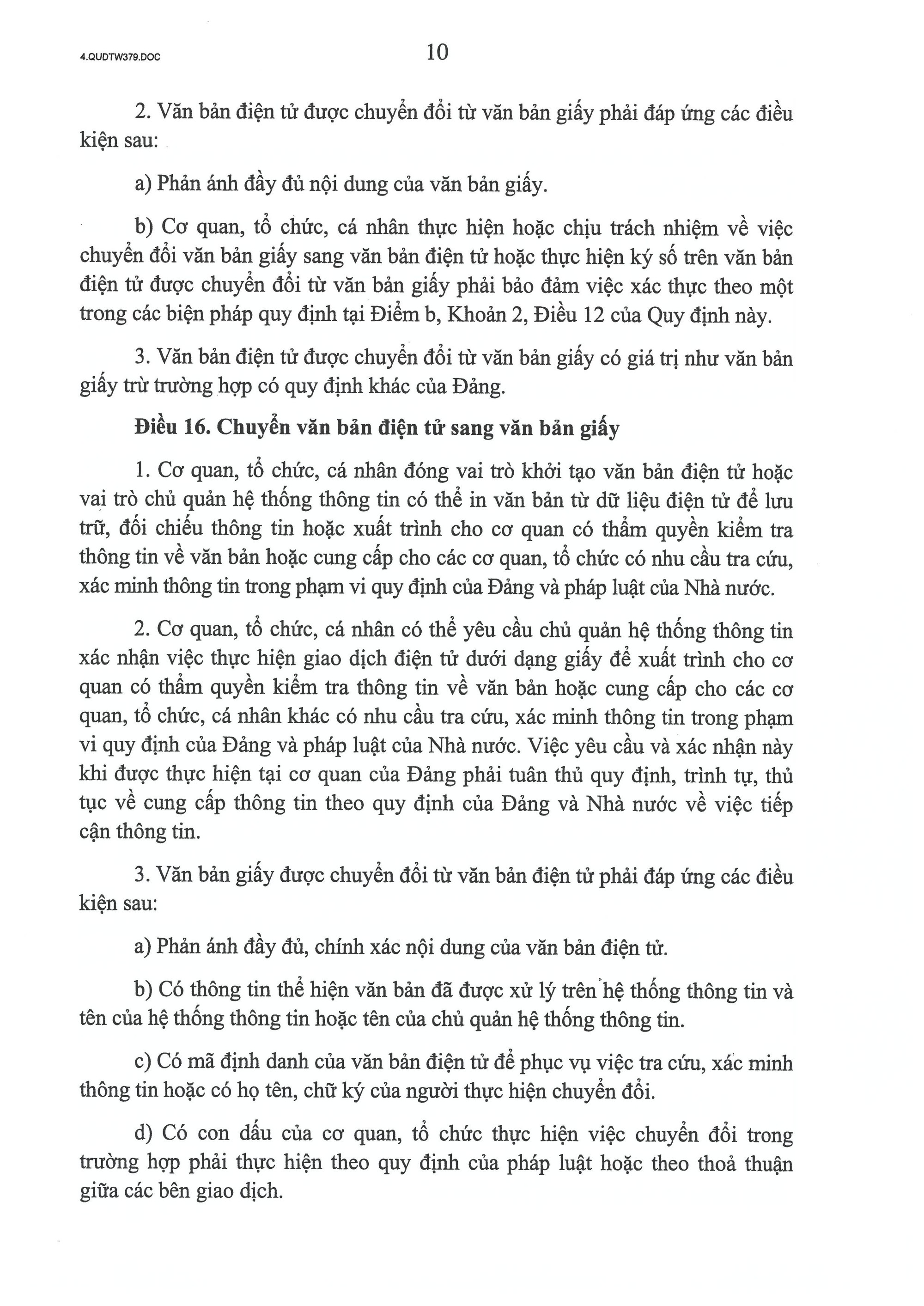 2. Bắt buộc sử dụng văn bản điện tử trong hoạt động của các cơ quan, tổ chức đảng; chỉ chuyển đổi hình thức từ văn bản điện tử sang văn bản giấy trong các trường hợp thật sự cần thiết hoặc theo các quy định của Đảng và Nhà nước.