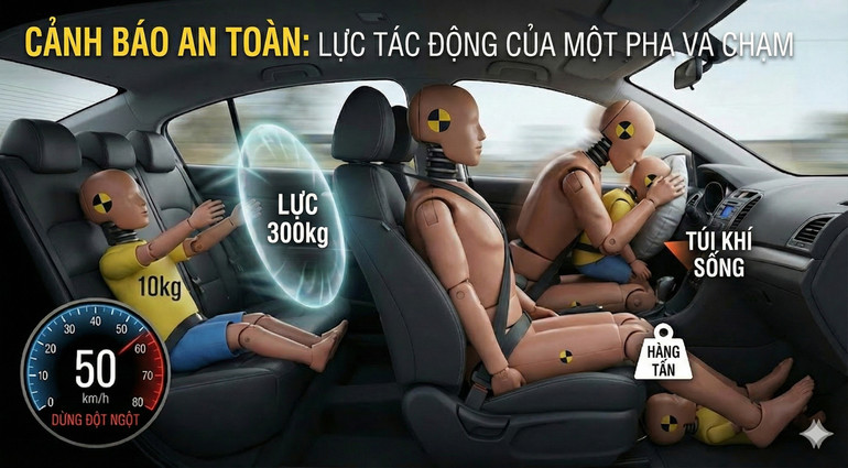 Trong văn hóa Á Đông, hình ảnh người mẹ, người bà bế đứa trẻ trong lòng khi đi xe ô tô được xem là biểu tượng tuyệt đối của sự che chở. Chúng ta tin rằng không nơi nào an toàn bằng vòng tay mẹ. Nhưng khi một chiếc xe chạy với tốc độ 50km/h dừng lại đột ngột, mọi vật thể trong xe sẽ tiếp tục di chuyển với vận tốc 50km/h theo quán tính. Một đứa trẻ nặng 10kg trong tình huống đó sẽ lao đi với lực tương đương... 300kg. Không một vòng tay nào, dù yêu thương đến mấy, có thể giữ lại khối lượng đó. Nếu người lớn không thắt dây an toàn, họ sẽ đè lên đứa trẻ với sức nặng hàng tấn. Nếu họ thắt dây an toàn nhưng bế trẻ, đứa trẻ sẽ trở thành "túi khí sống" chịu toàn bộ lực va đập vào bảng táp-lô hoặc ghế trước.
