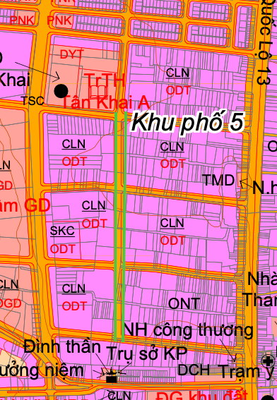 Bên cạnh các tuyến song song, quy hoạch còn ghi nhận một đoạn đường chạy vuông góc với Quốc lộ 13. Tuyến này có chiều dài khoảng 750 m, nằm gần Đình thần xã Tân Khai. Đây là trục ngang quan trọng giúp thoát nước và kết nối hạ tầng từ các khu vực phía trong ra phía ngoài mặt tiền Quốc lộ.