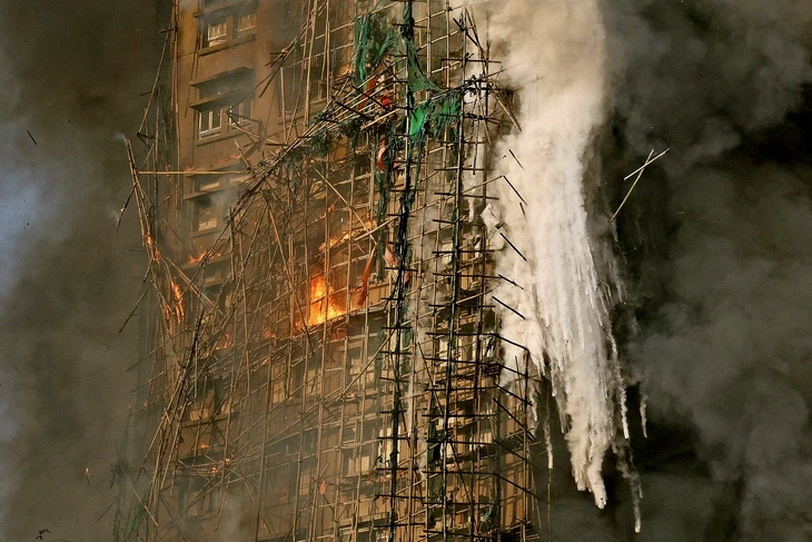 Phần giàn giáo tre lộ diện khi lửa thiêu rụi một tòa nhà ở Wang Fuk Court - Ảnh: Reuters