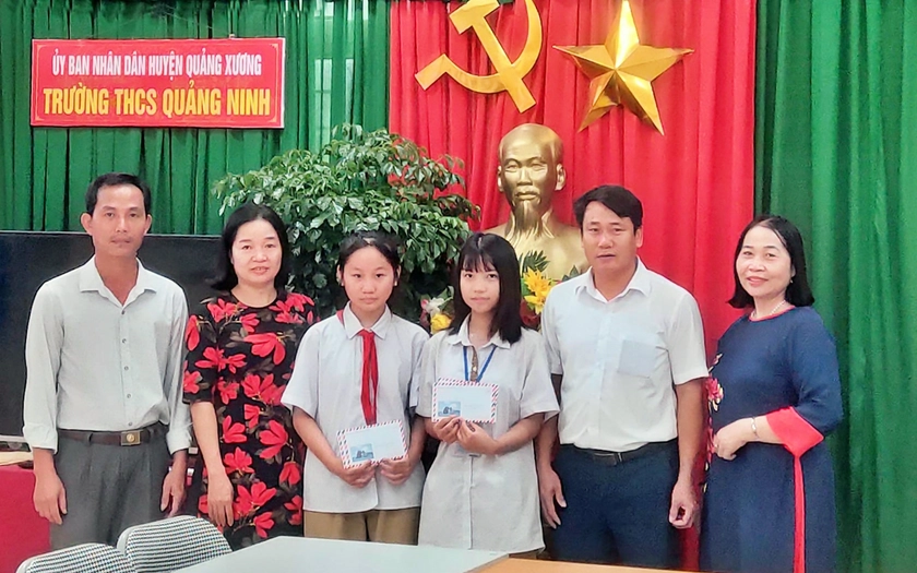 Trường Trung học cơ sở Quảng Ninh (Thanh Hóa) và Chi hội khuyến học nhà trường phối hợp với Hội Cha mẹ học sinh, Hội khuyến học xã Quảng Ninh trao thưởng cho hai em học sinh giỏi Đào Ngọc Trà My và Lê Khánh Vy. Ảnh: Hội khuyến học xã Quảng Ninh