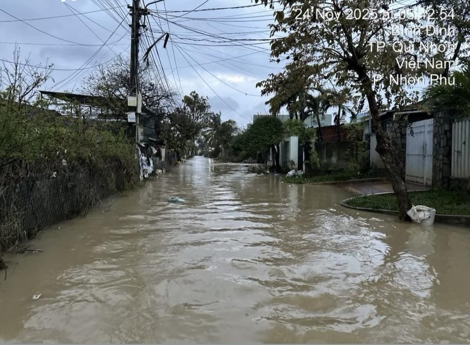 Sáng 24/11, Đài khí tượng thủy văn tỉnh Gia Lai cho biết trong đêm qua và rạng sáng nay xảy ra mưa lớn khiến một số khu dân cư ở các vùng phía Đông Gia Lai (Bình Định cũ) bị ngập trở lại, trong đó có xã Tuy Phước, Quy Nhơn. Trong ảnh là khu vực đường Nguyễn Bá Tòng (phường Nhơn Phú, TP Quy Nhơn cũ) chìm trong nước lũ lúc gần 7h sáng 21/11. Ảnh: Page Bình Định.