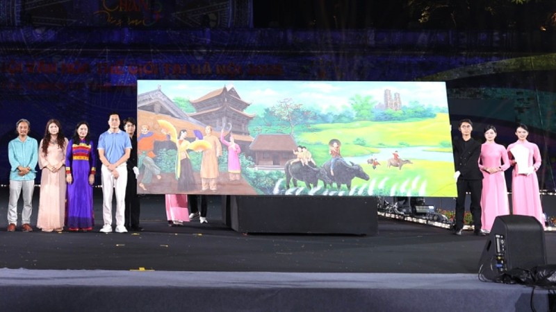 Bức tranh “Điệu chèo cổ và tiếng sáo diều trên cánh đồng vàng” được đấu giá với mức 1 tỷ đồng. (Ảnh: TL).