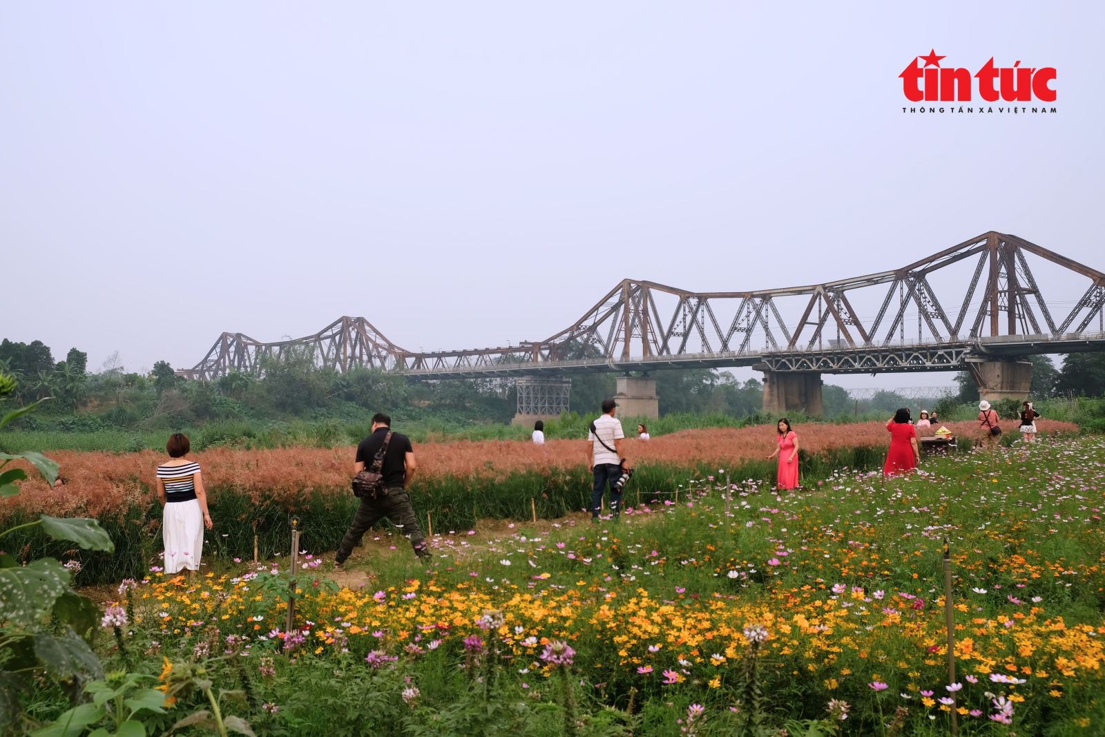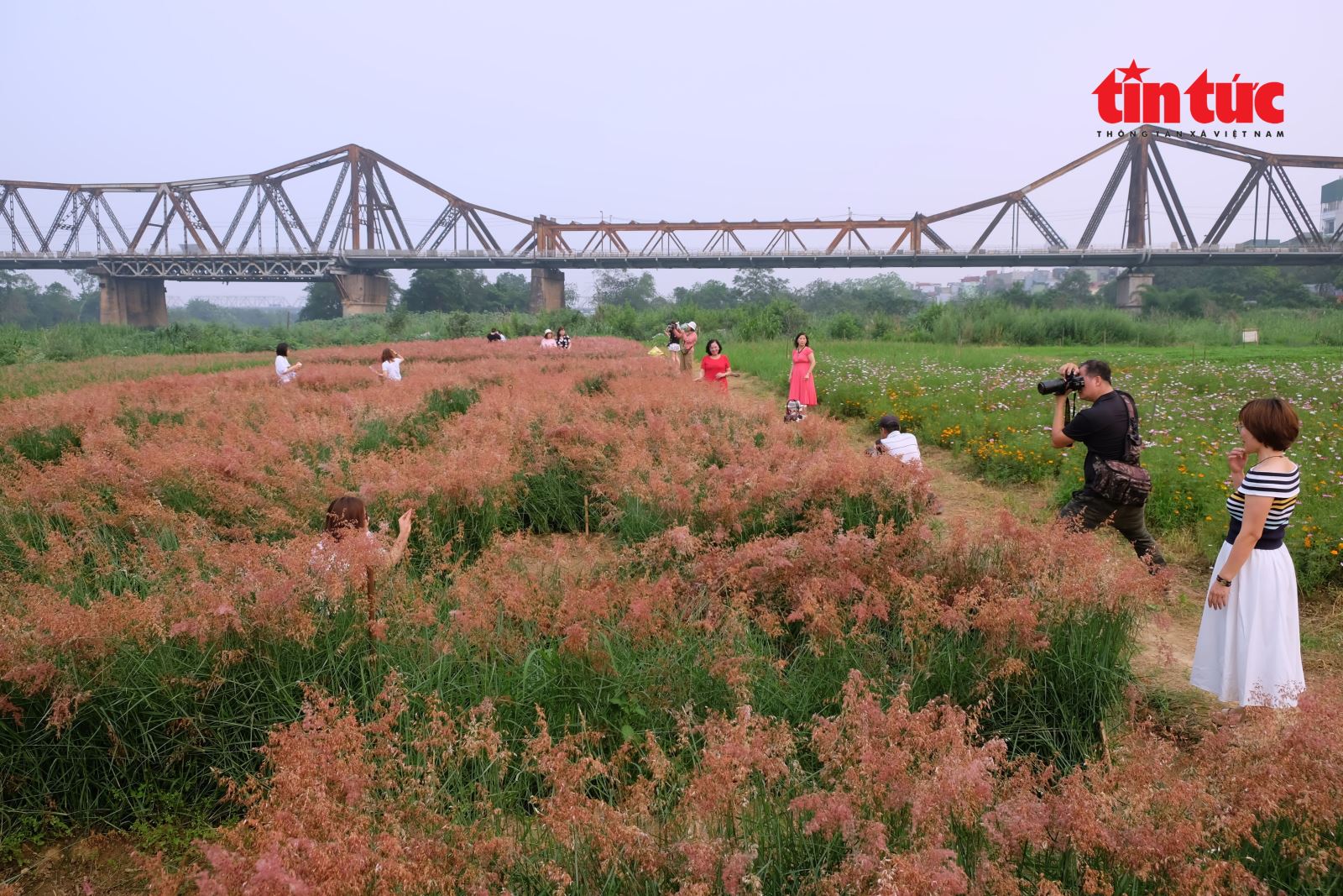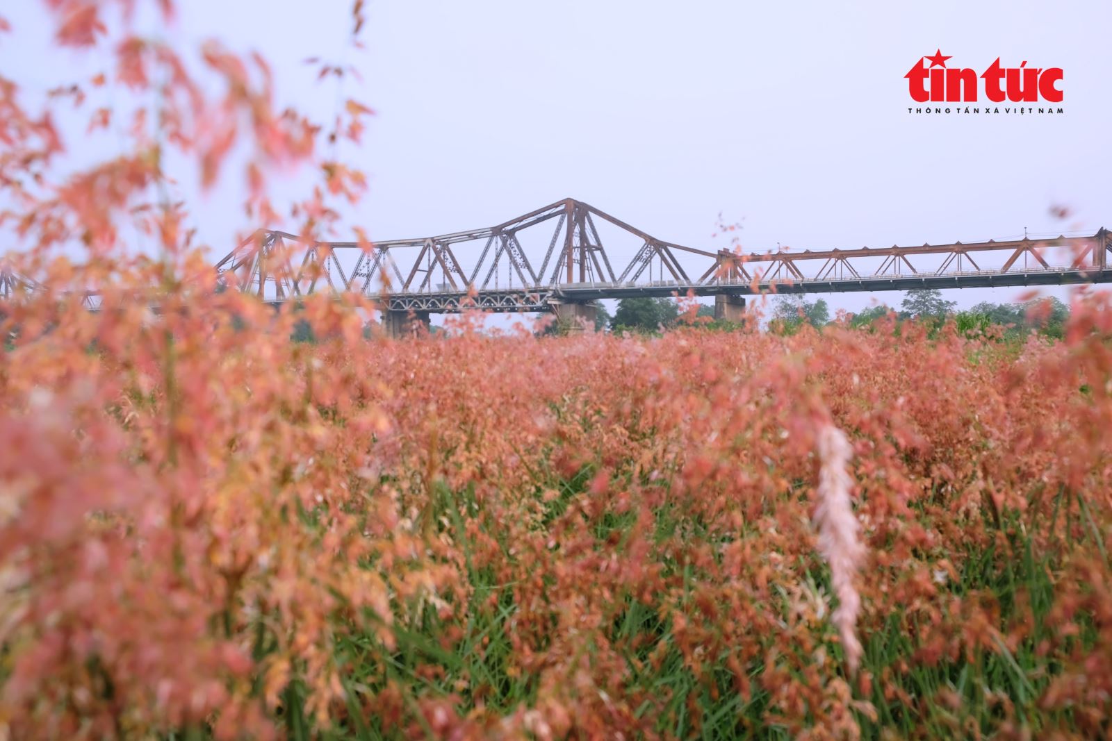 Cây cầu Long Biên cổ kính ẩn hiện sau vườn cỏ hồng mềm mại.