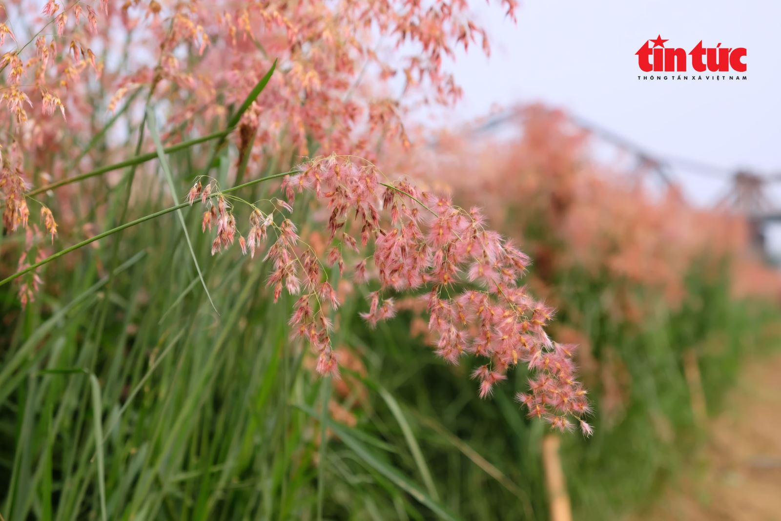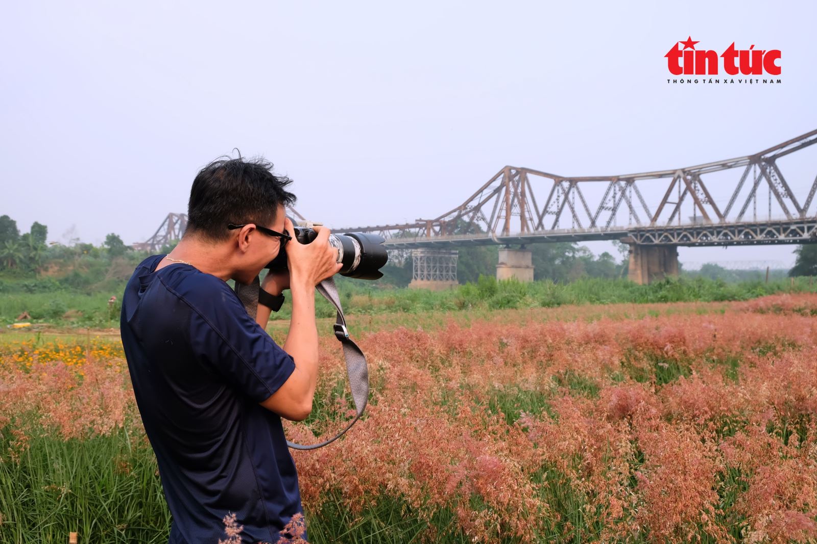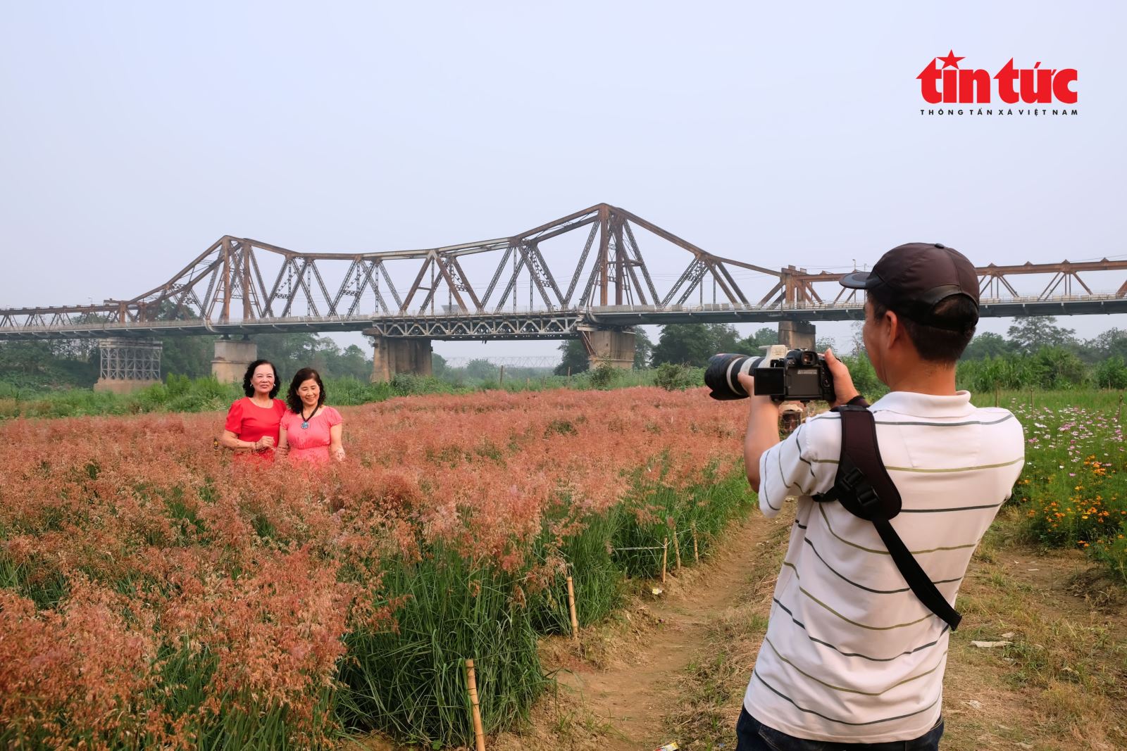 Cây cầu Long Biên cổ kính ẩn hiện sau vườn cỏ hồng mềm mại.