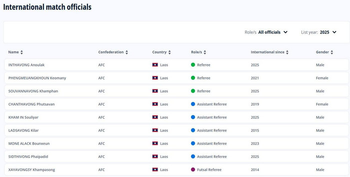Theo thông tin được cập nhật trên trang chủ FIFA, nữ trọng tài Lào Chanthavong Phutsavan không bị đánh rớt cấp FIFA, bất chấp những tranh cãi xoay quanh trận chung kết SEA Games 33. Ảnh chụp màn hình