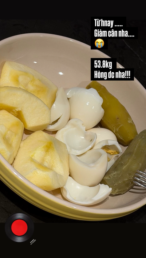 Mới đây, trên trang cá nhân, Hari Won – bà xã của MC Trấn Thành đã đăng tải hình ảnh bữa ăn giảm cân gồm trứng luộc, khoai lang và táo, kèm dòng trạng thái ngắn gọn: “Từ nay, giảm cân nha”. Nữ ca sĩ còn tiết lộ cân nặng hiện tại của mình là 53,8 kg, đồng thời bày tỏ sự quyết tâm trong việc siết dáng.