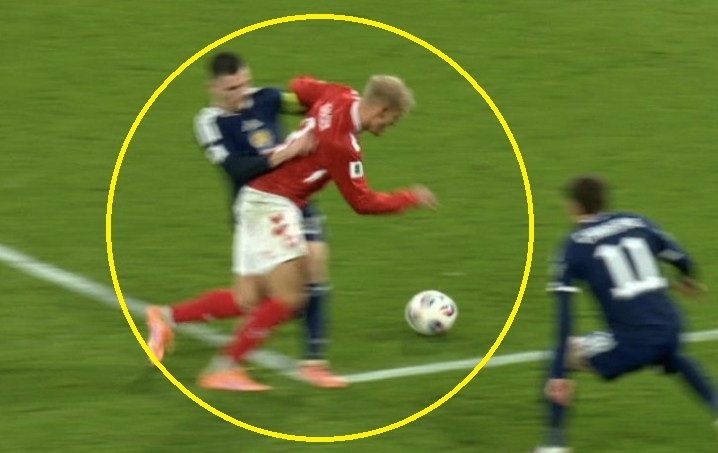 Phút 56 trận đấu trên sân Hampden Park, Andy Robertson đốn ngã Gustav Isaksen ở sát vạch 16,5 m. Video làm chậm cho thấy cầu thủ bên phía Đan Mạch còn chưa bước vào vùng cấm. Dù vậy, trọng tài chính vẫn ra ngoài biên, xem lại video làm chậm và chỉ trong vài giây, ông quay lại, cho đội khách hưởng phạt đền.