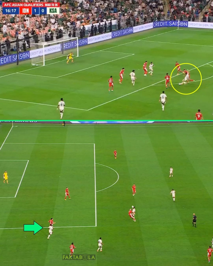 Tranh cãi nổ ra ở bàn gỡ hòa 1-1 của Saudi Arabia. Từ một pha ném biên bên cánh trái, hậu vệ Indonesia phá bóng lỗi, tạo điều kiện để đội chủ nhà phối hợp nhanh giữa bốn cầu thủ. Bóng được trả ngược ra trước vòng cấm cho Saleh Abu Al Shamat, cầu thủ này xử lý khéo léo trước khi tung cú sút chân trái sát vạch 16m50, đưa bóng vào góc phải khung thành. Thủ môn Maarten Paes bay người hết cỡ nhưng không thể cứu thua.