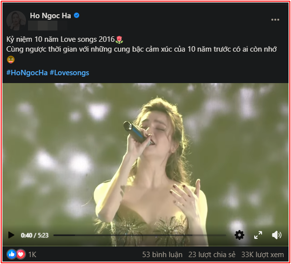 Đi kèm với đoạn clip, Hồ Ngọc Hà chia sẻ dòng trạng thái ngắn gọn nhưng giàu cảm xúc: "Kỷ niệm 10 năm Love Songs 2016. Cùng ngược thời gian với những cung bậc cảm xúc của 10 năm trước, có ai còn nhớ?". Câu hỏi tưởng chừng đơn giản này lại nhanh chóng chạm đến trái tim của cộng đồng người hâm mộ, kéo họ trở về với những ký ức âm nhạc khó quên. Chỉ sau thời gian ngắn đăng tải, bài viết đã nhận về hàng nghìn lượt tương tác cùng vô số bình luận bày tỏ sự xúc động, hoài niệm và cả sự mong chờ cho những dự án tương tự trong tương lai.