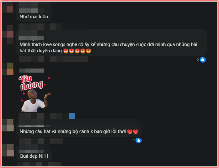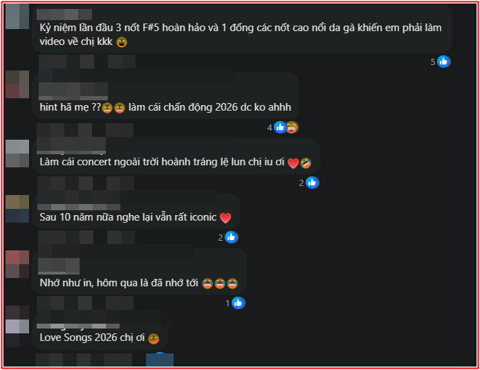 Phía dưới phần bình luận, nhiều khán giả không giấu được sự hào hứng khi nhắc lại những khoảnh khắc ấn tượng trong đêm nhạc năm ấy. Có người nhớ như in những nốt cao "nổi da gà", có người lại ấn tượng với cách nữ ca sĩ kể chuyện qua âm nhạc một cách duyên dáng và đầy cảm xúc. Không ít ý kiến còn bày tỏ mong muốn Hồ Ngọc Hà sẽ sớm tổ chức một phiên bản Love Songs mới trong năm 2026 như một cách kỷ niệm hành trình 10 năm của chuỗi đêm nhạc này.