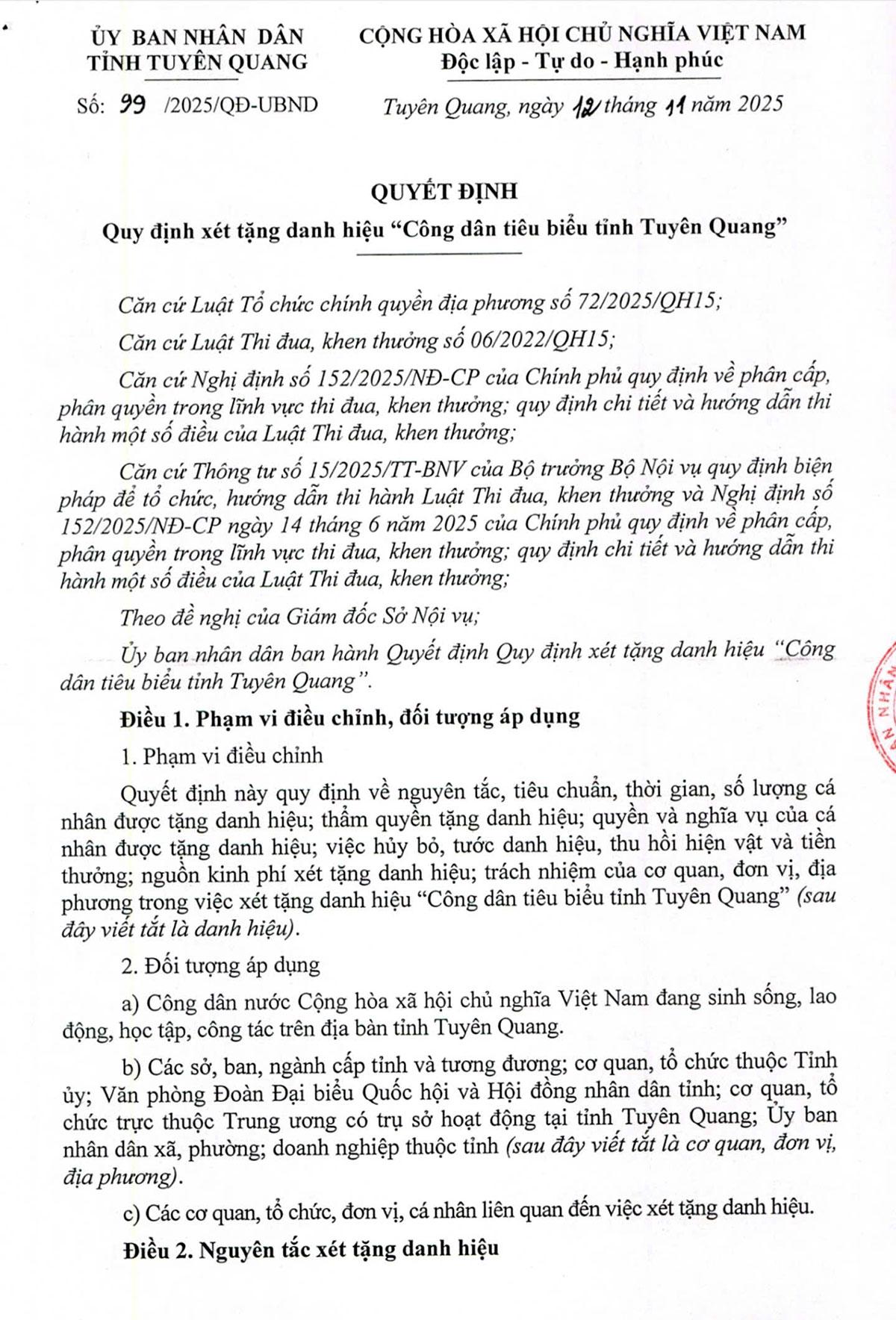Quyết định quy định xét tặng danh hiệu “Công dân tiêu biểu tỉnh Tuyên Quang”.