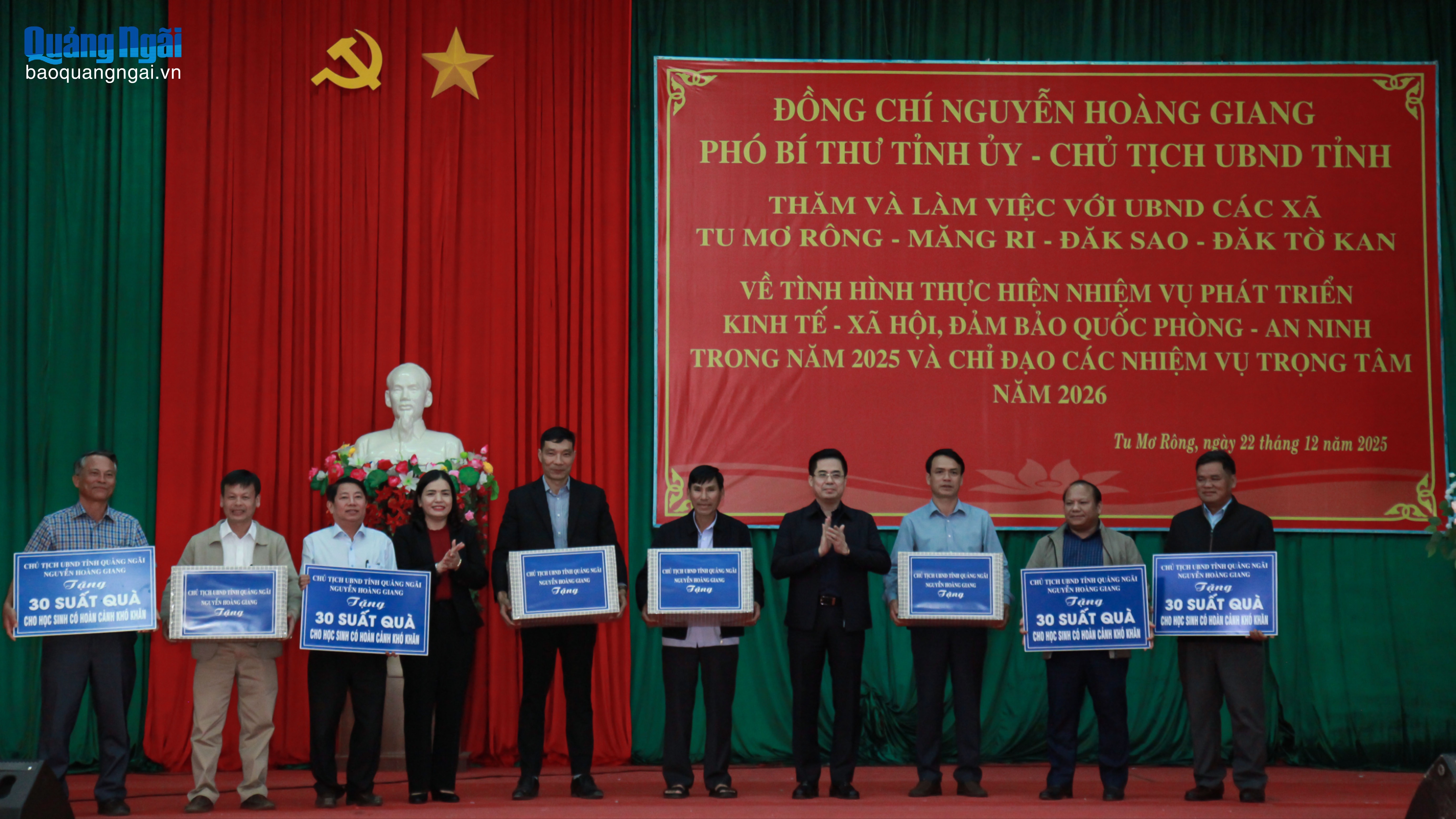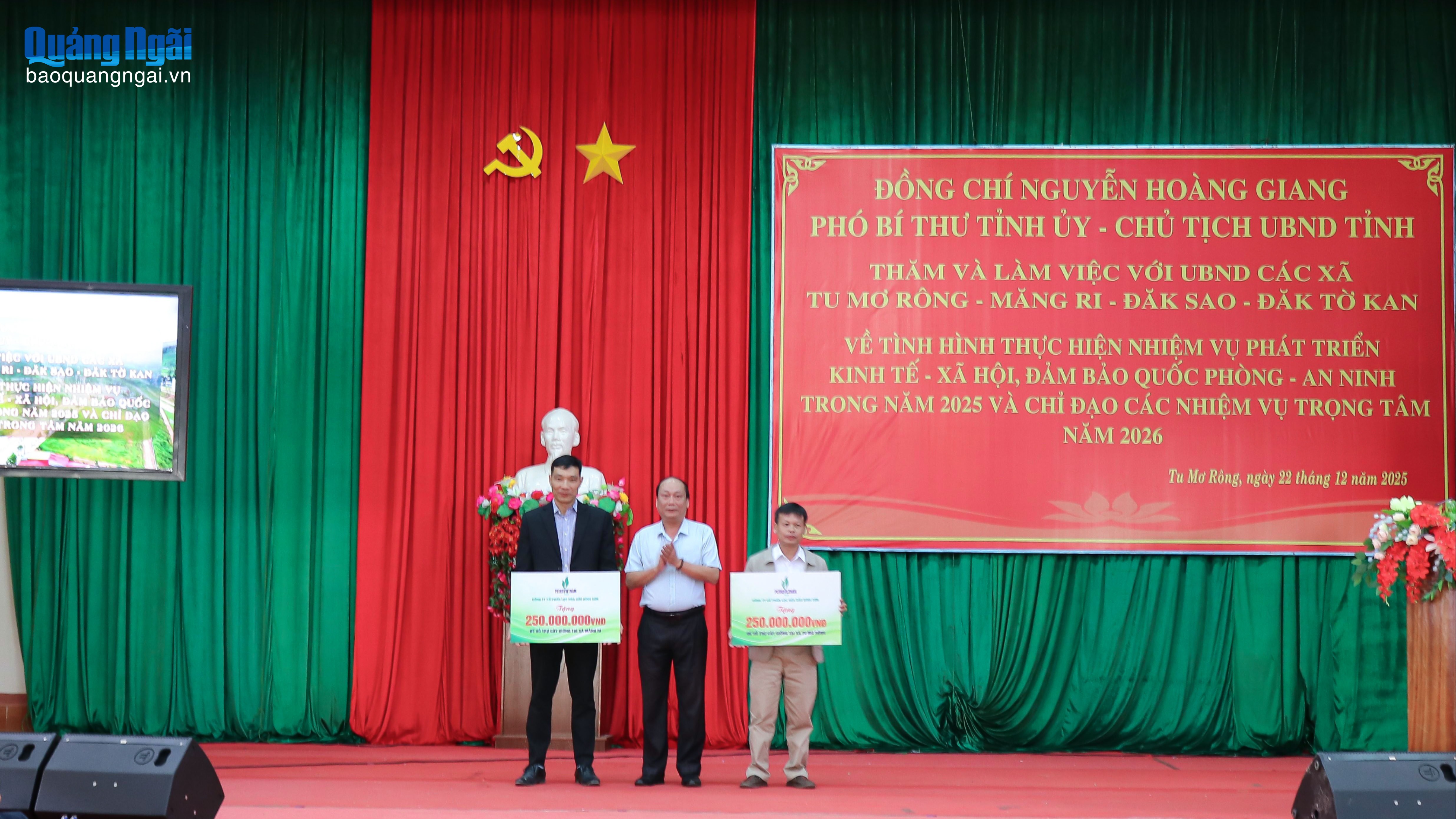 Dịp này, Phó Bí thư Tỉnh ủy, Chủ tịch UBND tỉnh Nguyễn Hoàng Giang trao quà cho các xã và học sinh có hoàn cảnh khó khăn trên địa bàn. Công ty CP Lọc hóa dầu Bình Sơn hỗ trợ 2 xã Măng Ri và Tu Mơ Rông, mỗi xã 250 triệu đồng, để phát triển cây giống.