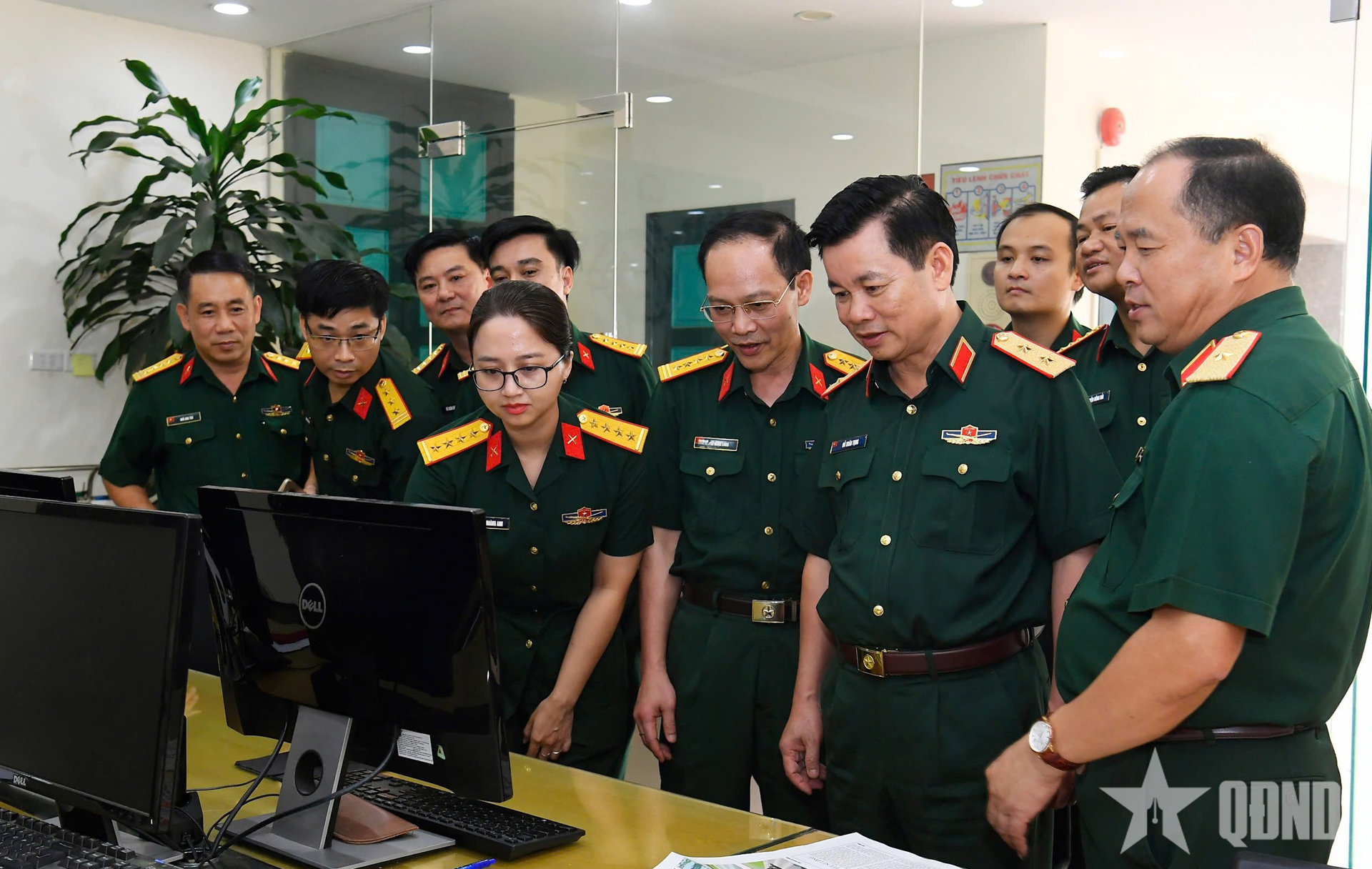 Lãnh đạo Tổng cục Chính trị Quân đội nhân dân Việt Nam kiểm tra công tác ứng dụng chuyển đổi số vào hoạt động chuyên môn tại Báo Quân đội nhân dân. Ảnh: TUẤN HUY