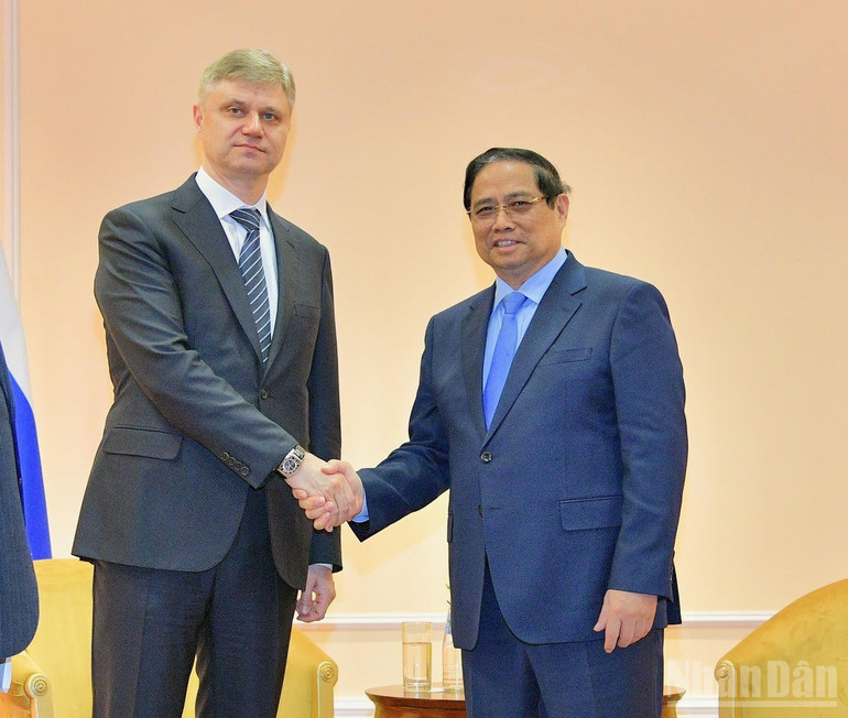 Thủ tướng Phạm Minh Chính và ông Belozerov Oleg Valentinovich, Tổng Giám đốc, Chủ tịch Hội đồng quản trị Công ty cổ phần Đường sắt Nga. (Ảnh: THANH GIANG)