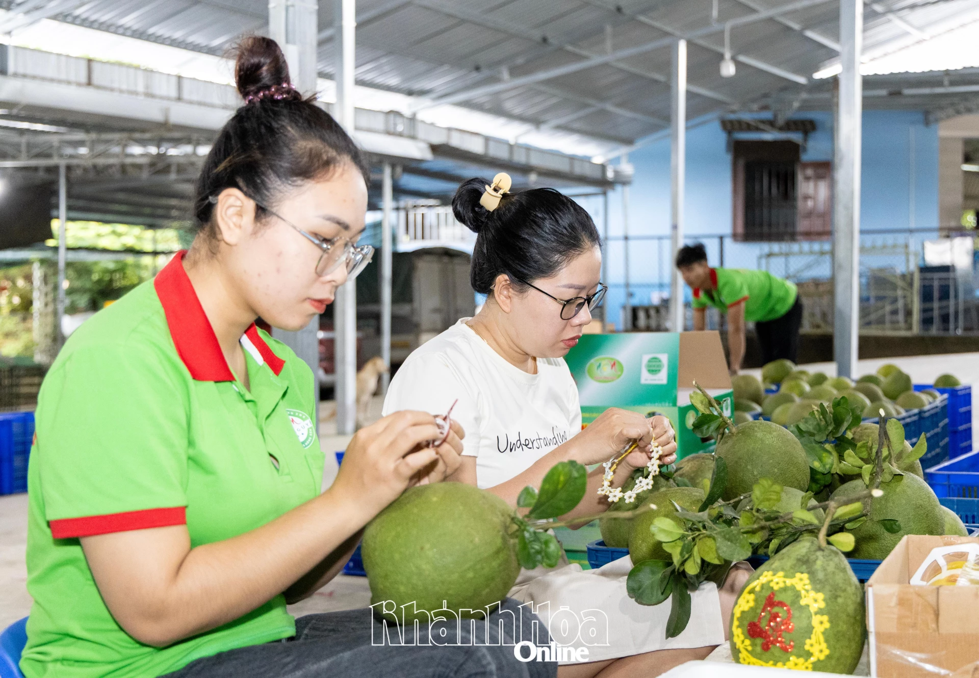 Nông dân xã Khánh Vĩnh đóng gói bưởi da xanh VietGAP.