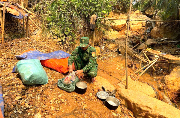 Còn đợt truy quét vào ngày 9/4/2026, tổ tuần tra liên ngành gồm lực lượng Bộ đội Biên phòng và Công an xã A Lưới 1 phát hiện tại khu vực khe suối Li Leng có các dụng cụ thủ công gồm 3 khay đãi, 5 cái Avin, 1 xẻng, 1 xà beng; tại khu vực khe Bùn phát hiện 2 người đang ở trong lán, tuy nhiên khi thấy lực lượng chức năng thì các đối tượng bỏ chạy vào rừng. Tại đây có 5 lán trại được dựng dọc bờ suối, bên trong mỗi lán có các dụng cụ để đãi vàng sa khoáng. Ngoài ra lực lượng chức năng còn phát hiện 3 hầm, mỗi hầm có chiều sâu khoảng 5 đến 10m được các đối tượng đào bới để lấy đất đãi vàng. Ngay sau đó, lực lượng chức năng tiến hành tiêu hủy lán trại và các dụng cụ trên.