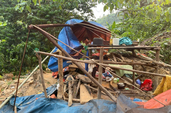 Lán trại nằm bên bờ suối do các đối tượng dựng lên để khai thác vàng trái phép.