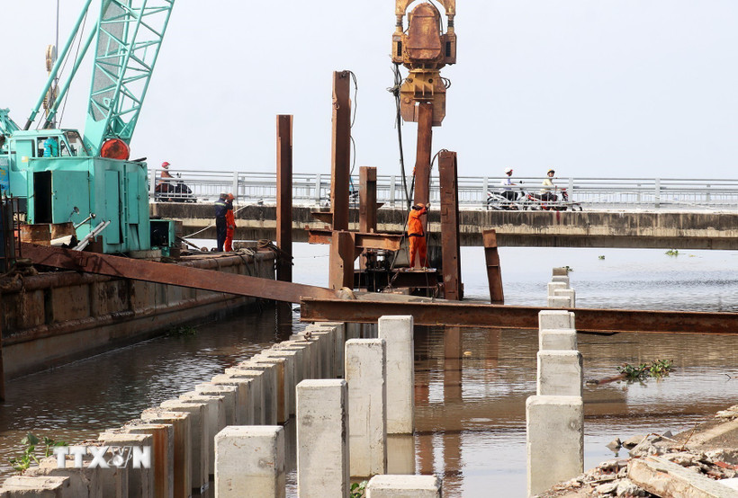 Dự án xây dựng kè biển mở rộng khu 16 ha phường Rạch Giá (An Giang) đang thi công. (Ảnh: Lê Huy Hải/TTXVN)