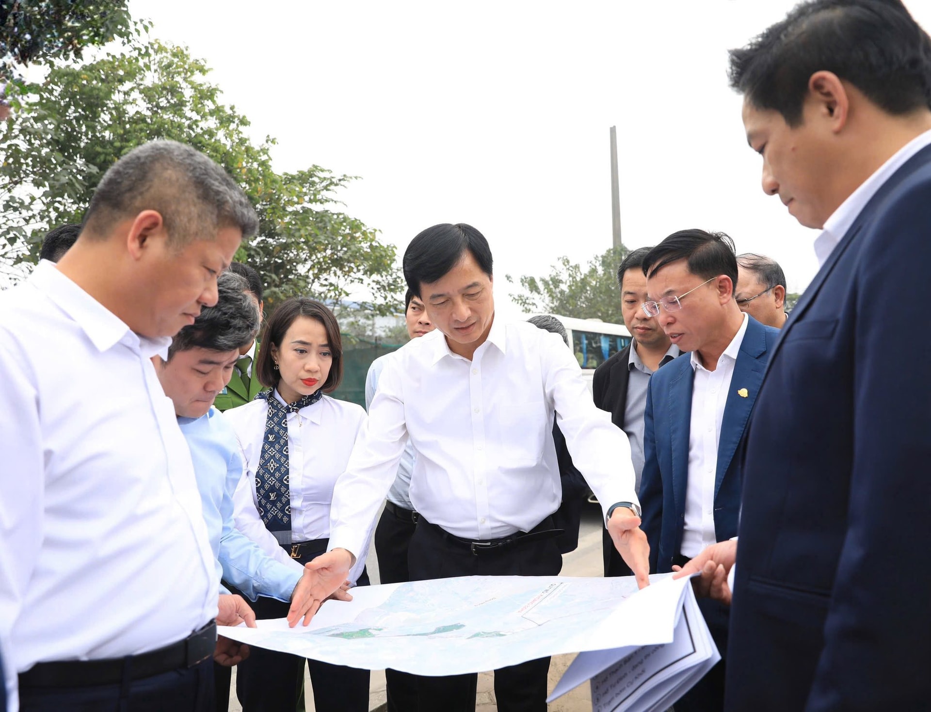 Ủy viên Bộ Chính trị, Bí thư Thành ủy Hà Nội Nguyễn Duy Ngọc cùng lãnh đạo phường Phúc Lợi kiểm tra việc kiểm soát, xử lý ô nhiễm môi trường tại sông Cầu Bây. Ảnh: PV.