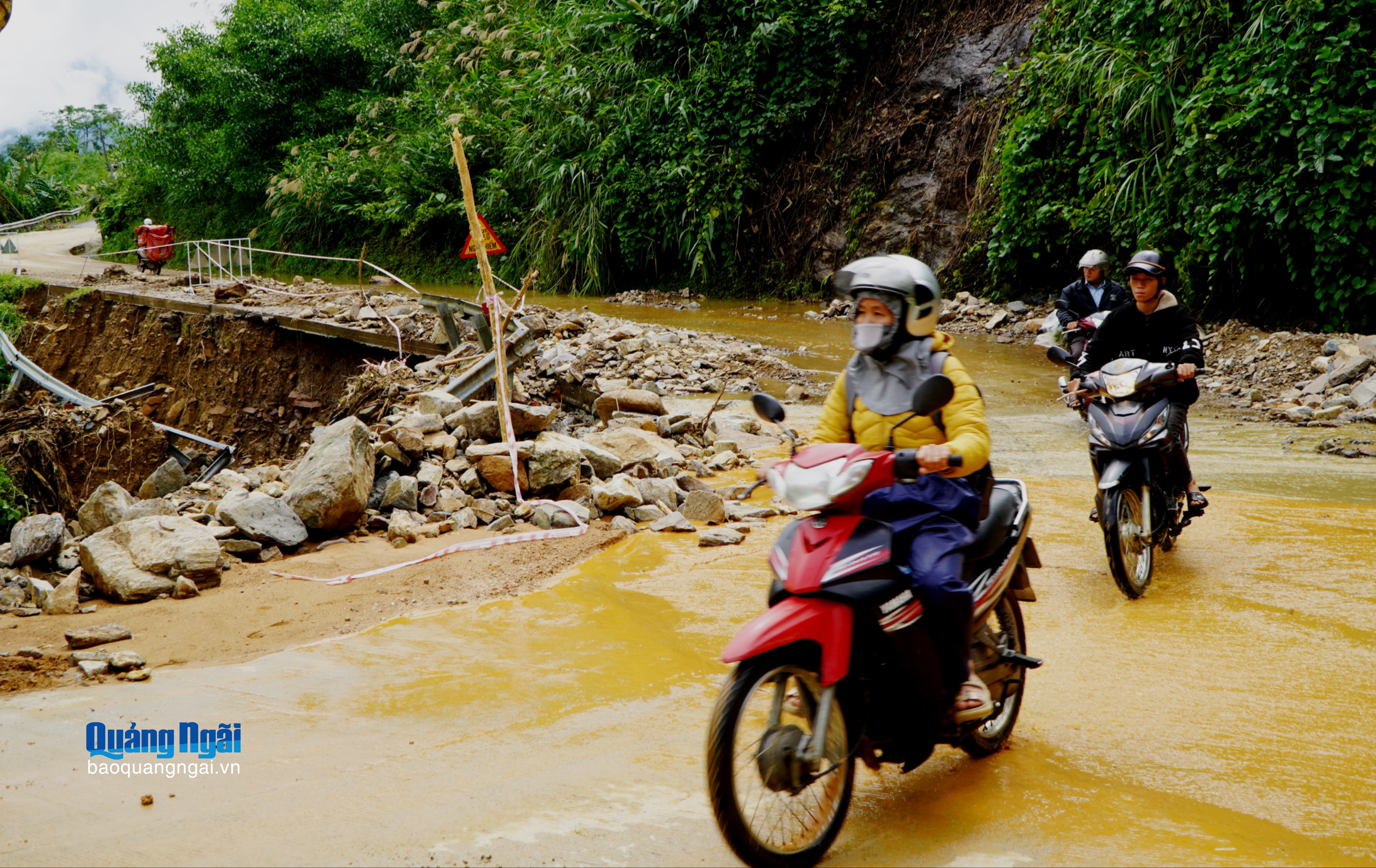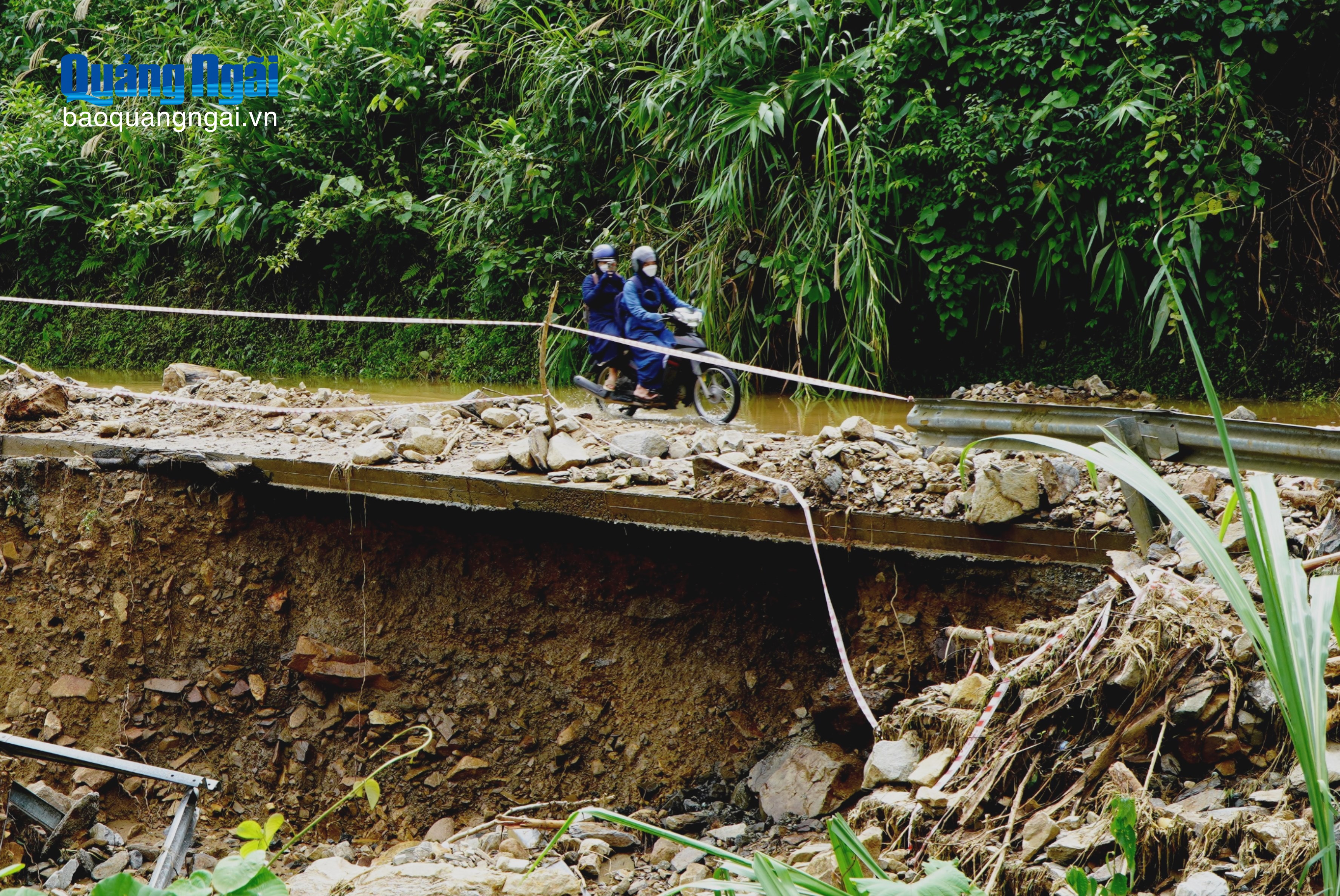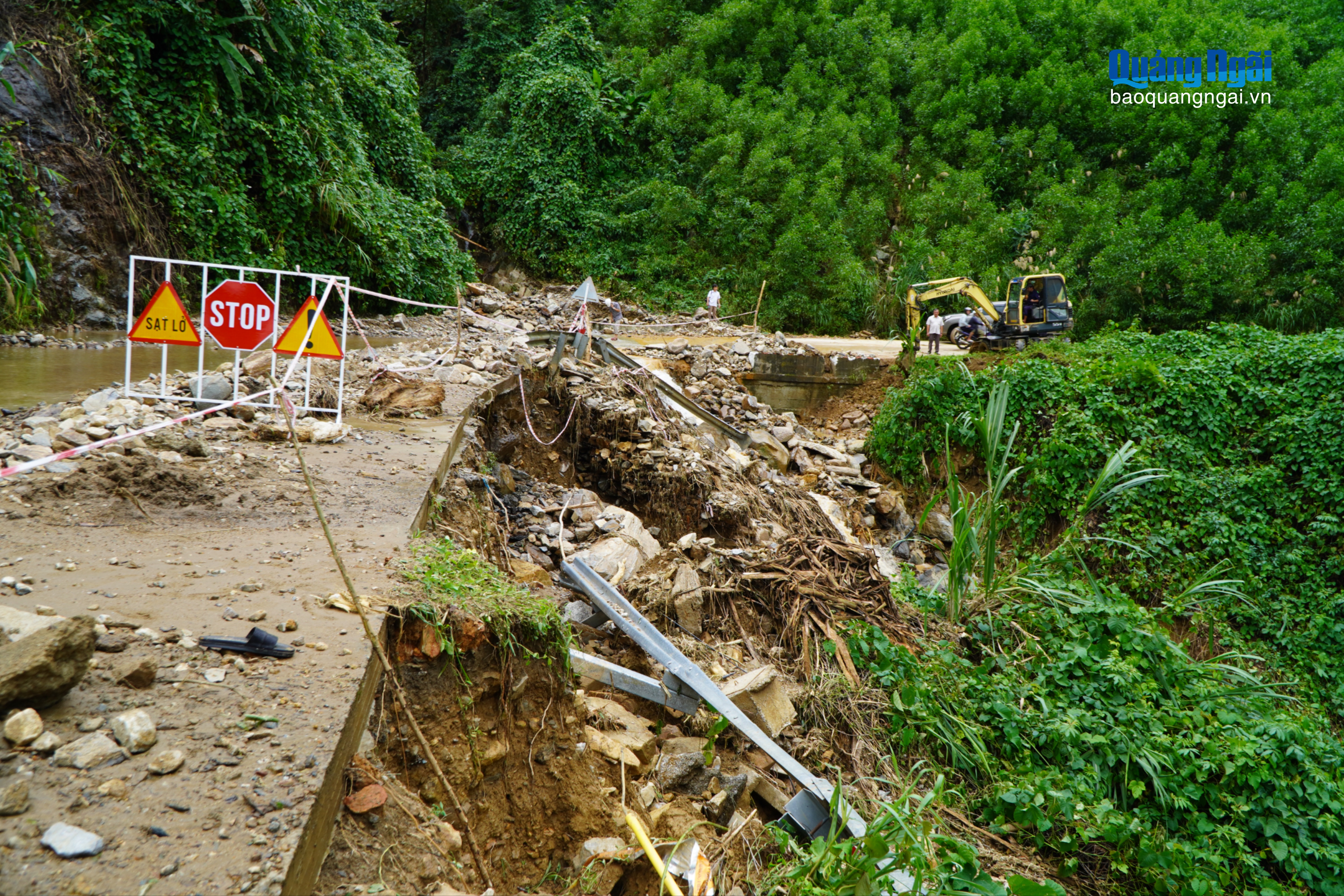 Ghi nhận tại hiện trường điểm sạt lở tại Km49+520 trên tuyến ĐT622B đoạn qua xã Tây Trà Bồng, lượng lớn đá tảng sạt từ trên đỉnh núi cao xuống tràn ra lòng đường; đồng thời ta-luy dương cũng sạt sâu vào bên dưới lòng đường, gây nguy hiểm cho người và phương tiện qua lại.